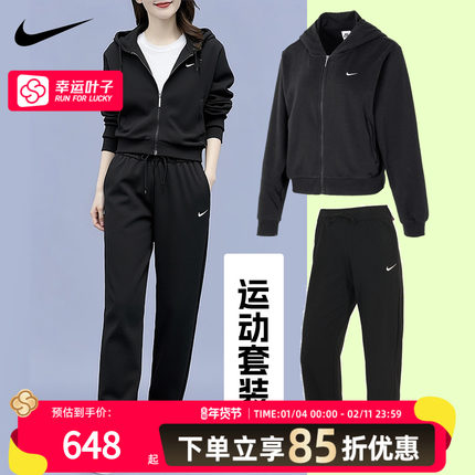 Nike耐克运动套装女款针织连帽夹克束脚长裤两件套冬季跑步套装