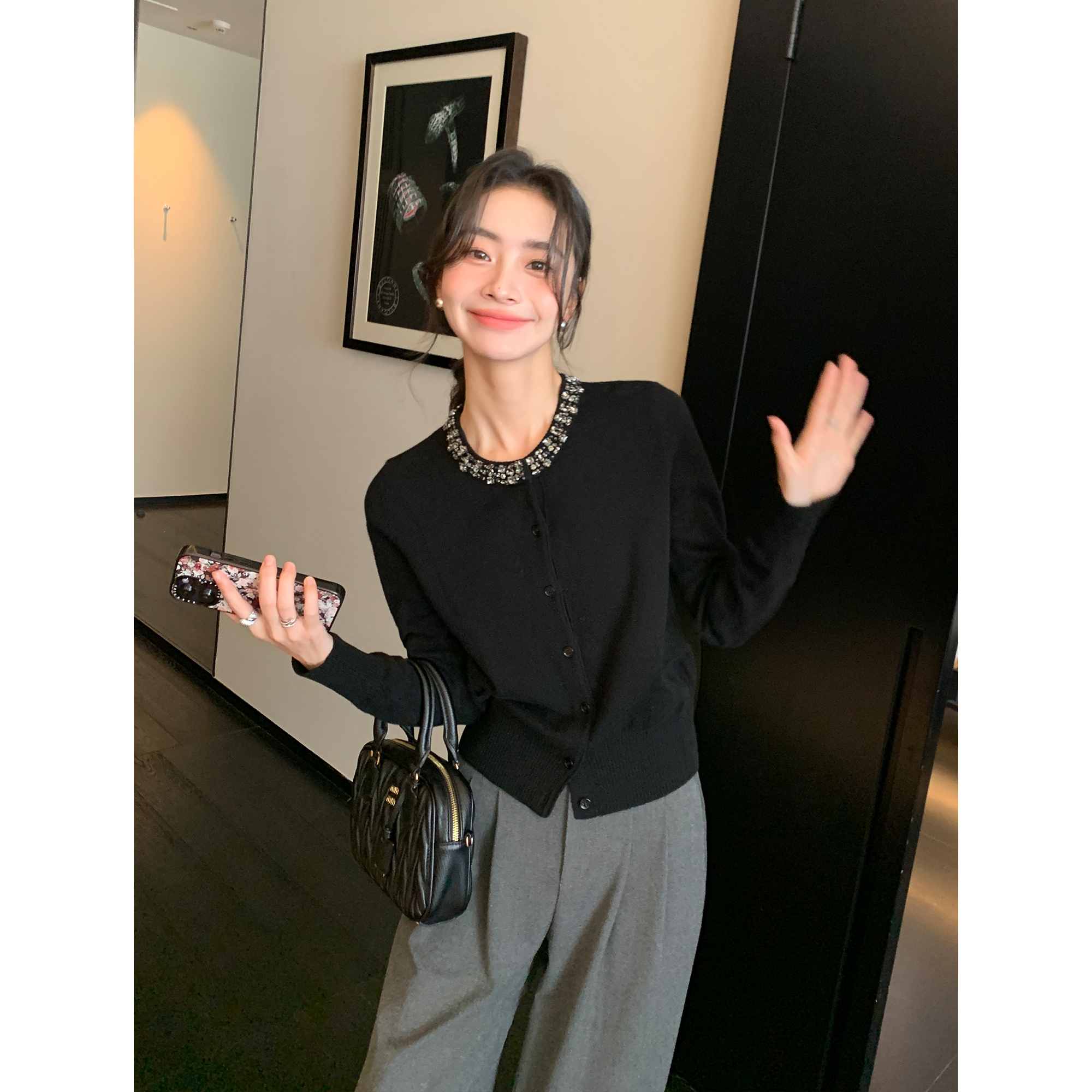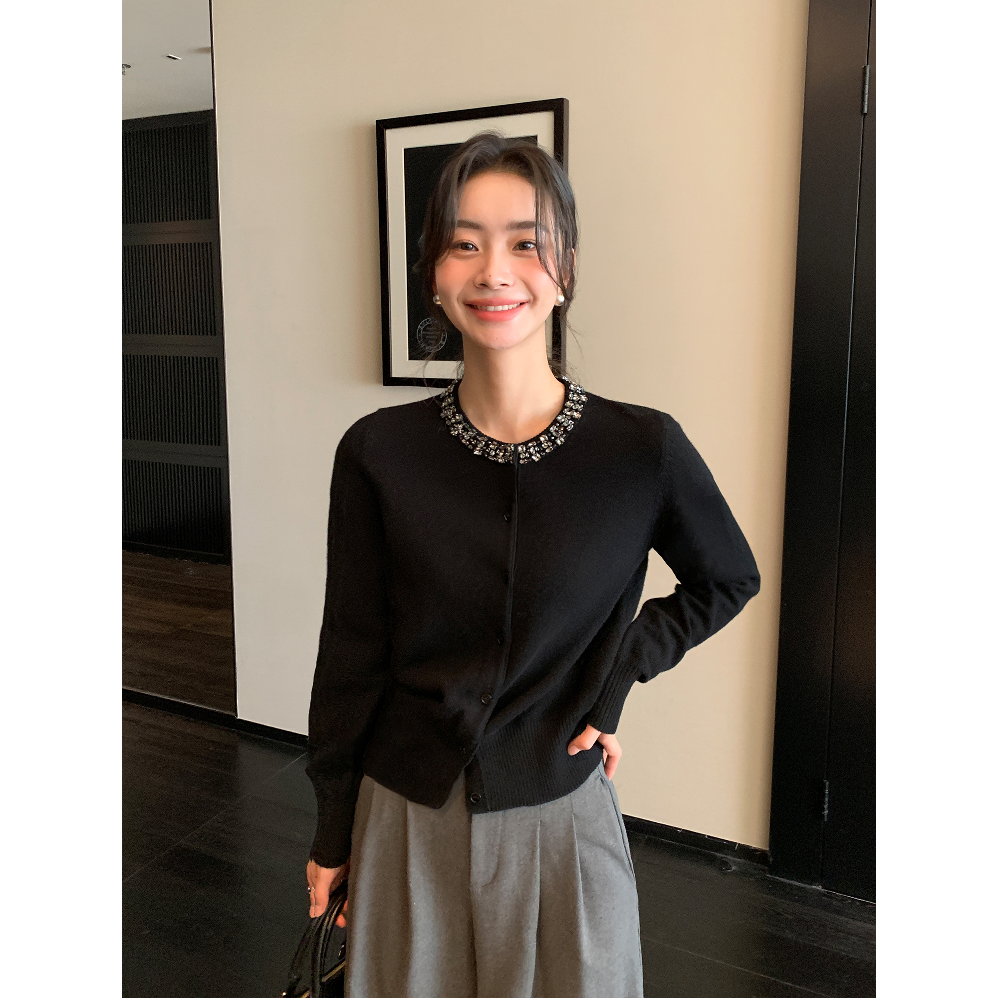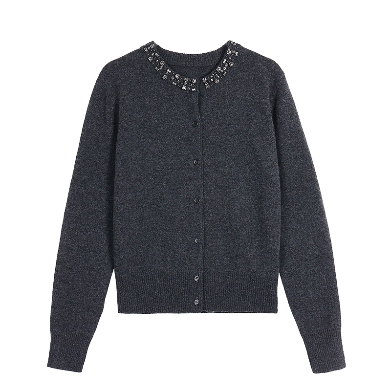 手工定珠圆领100羊毛针织开衫女