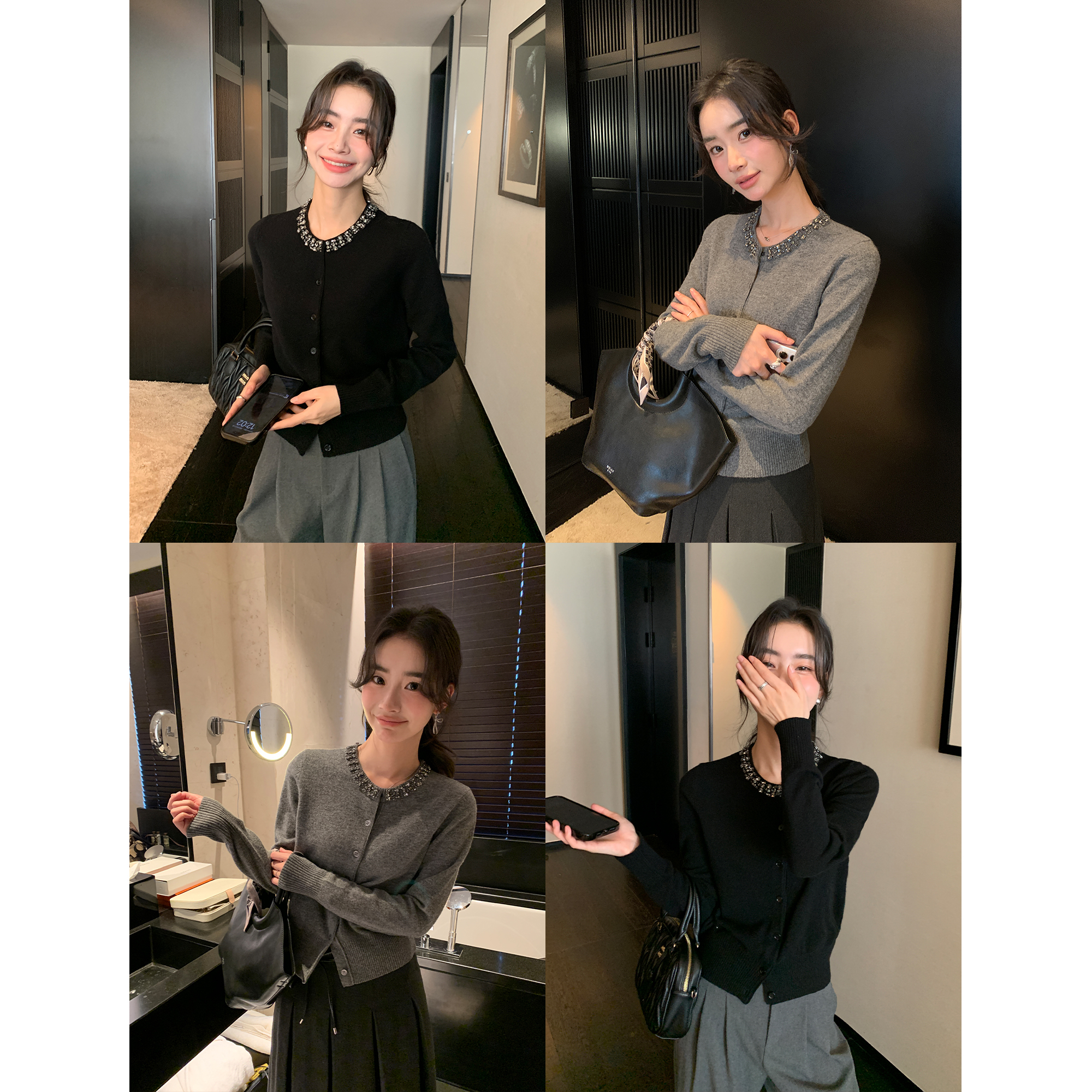 Maven Lin 高级手工定珠圆领100羊毛针织开衫女秋冬修身打底毛衣