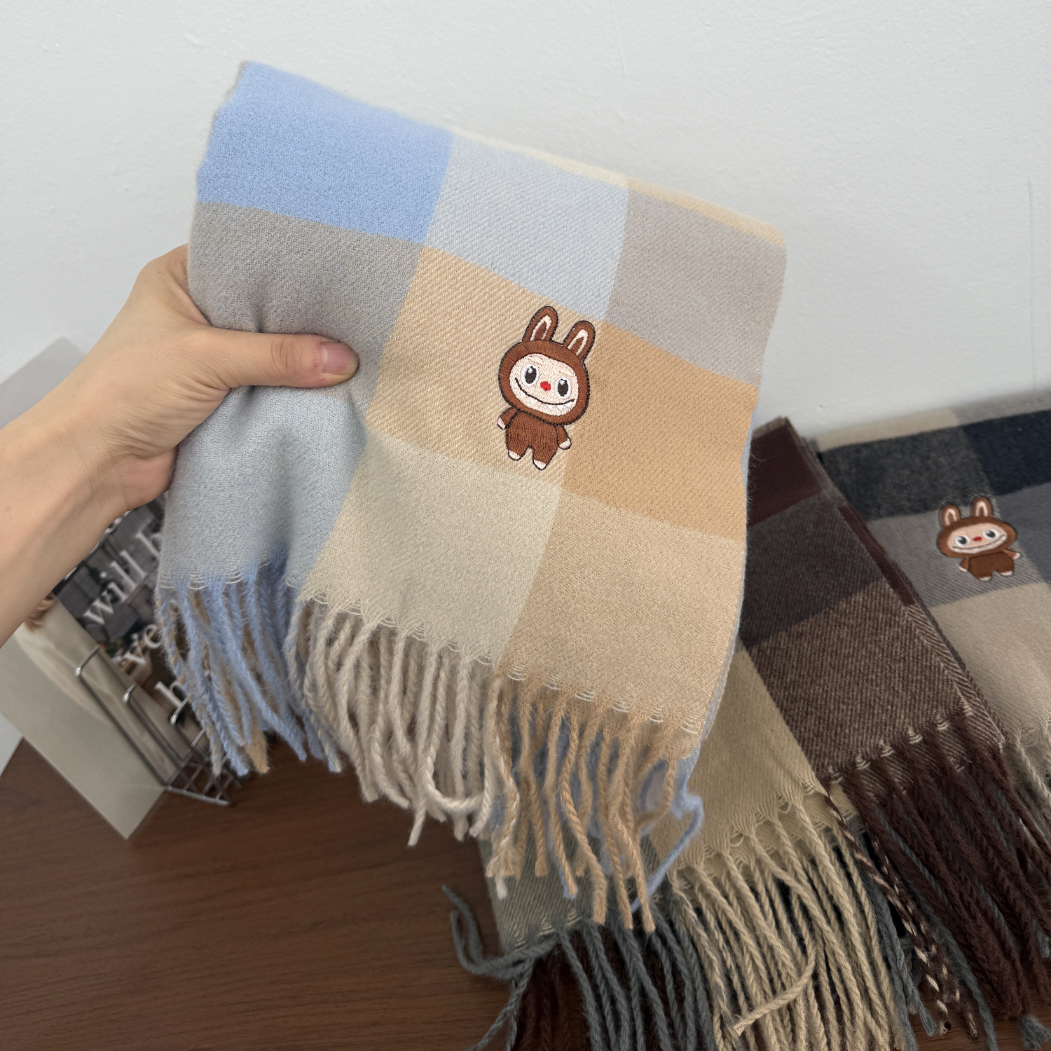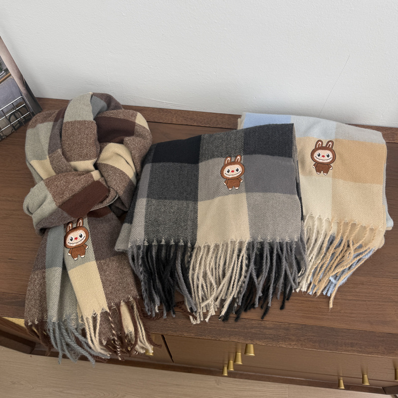 新款刺绣小熊韩系氛围感格纹围巾女秋冬季百搭保暖学生情侣围脖男