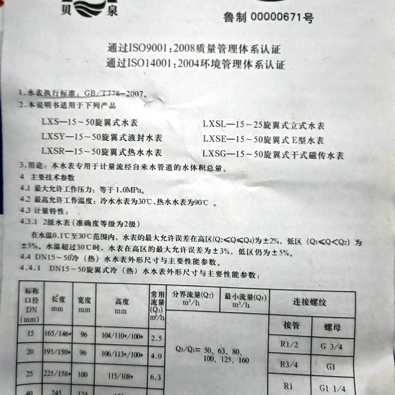 山东贝泉智能水表脉冲输出,可连接485通讯模块DN32,死扣