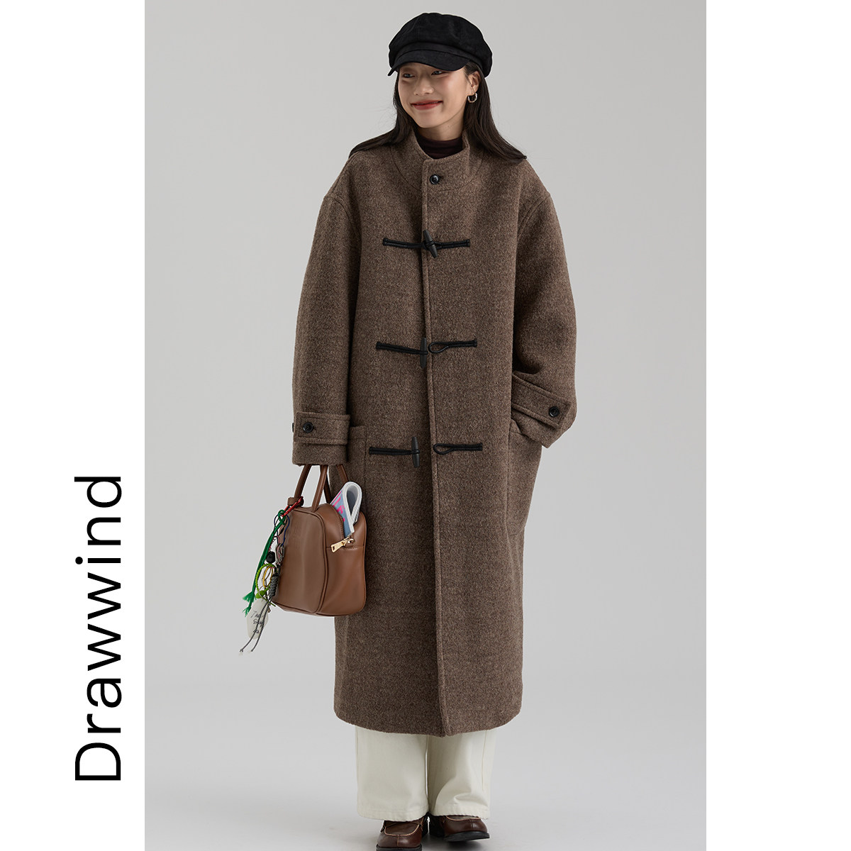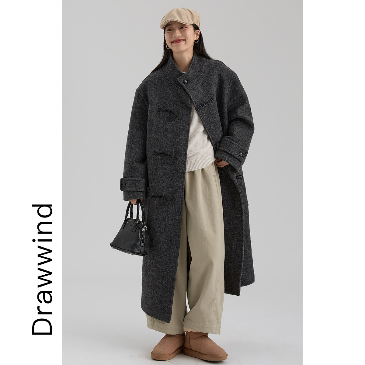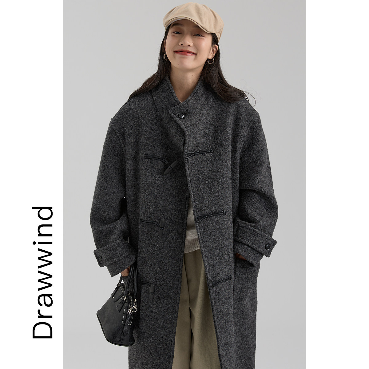 画风drawwind纯色羊毛呢大衣女2025秋冬新款宽松立领长款呢子外套