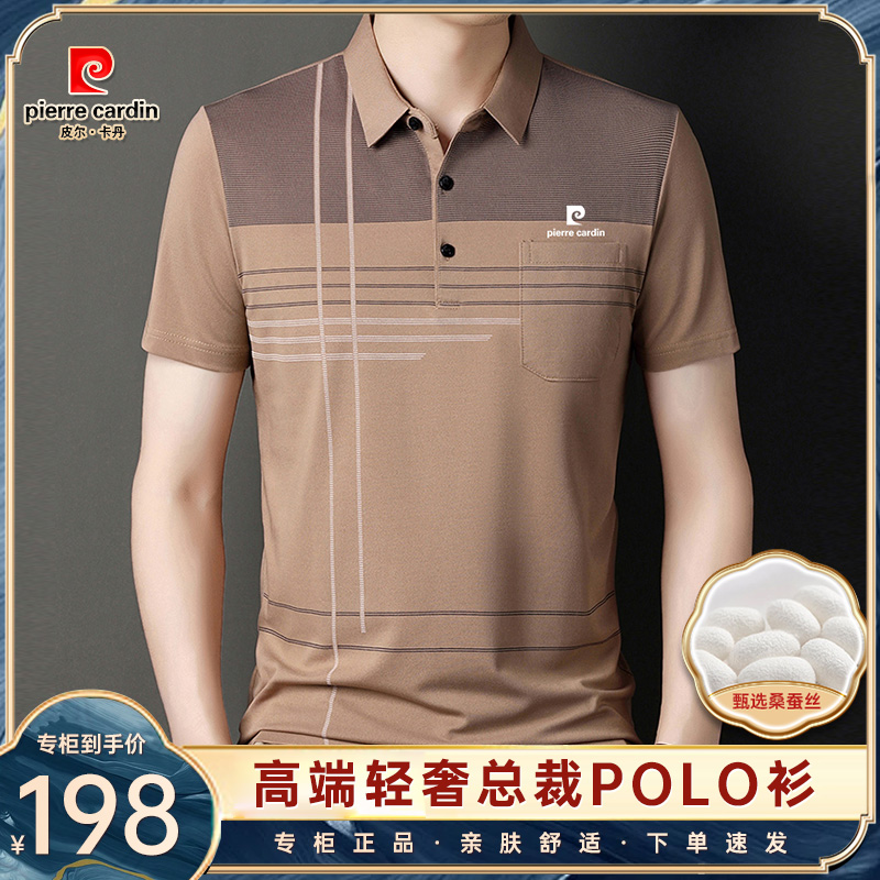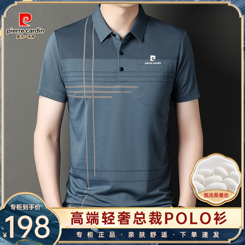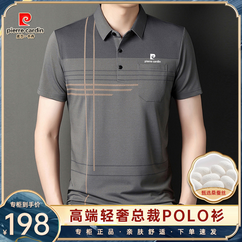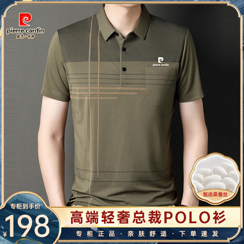 皮尔卡丹夏季男士桑蚕丝短袖polo衫中青年宽松舒适百搭翻领爸爸装