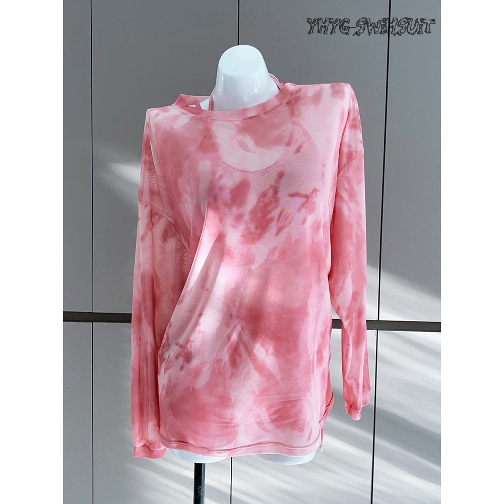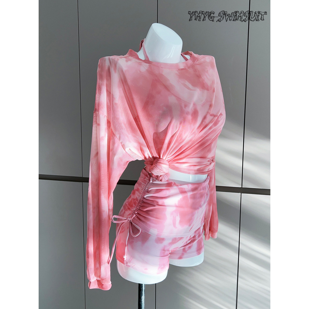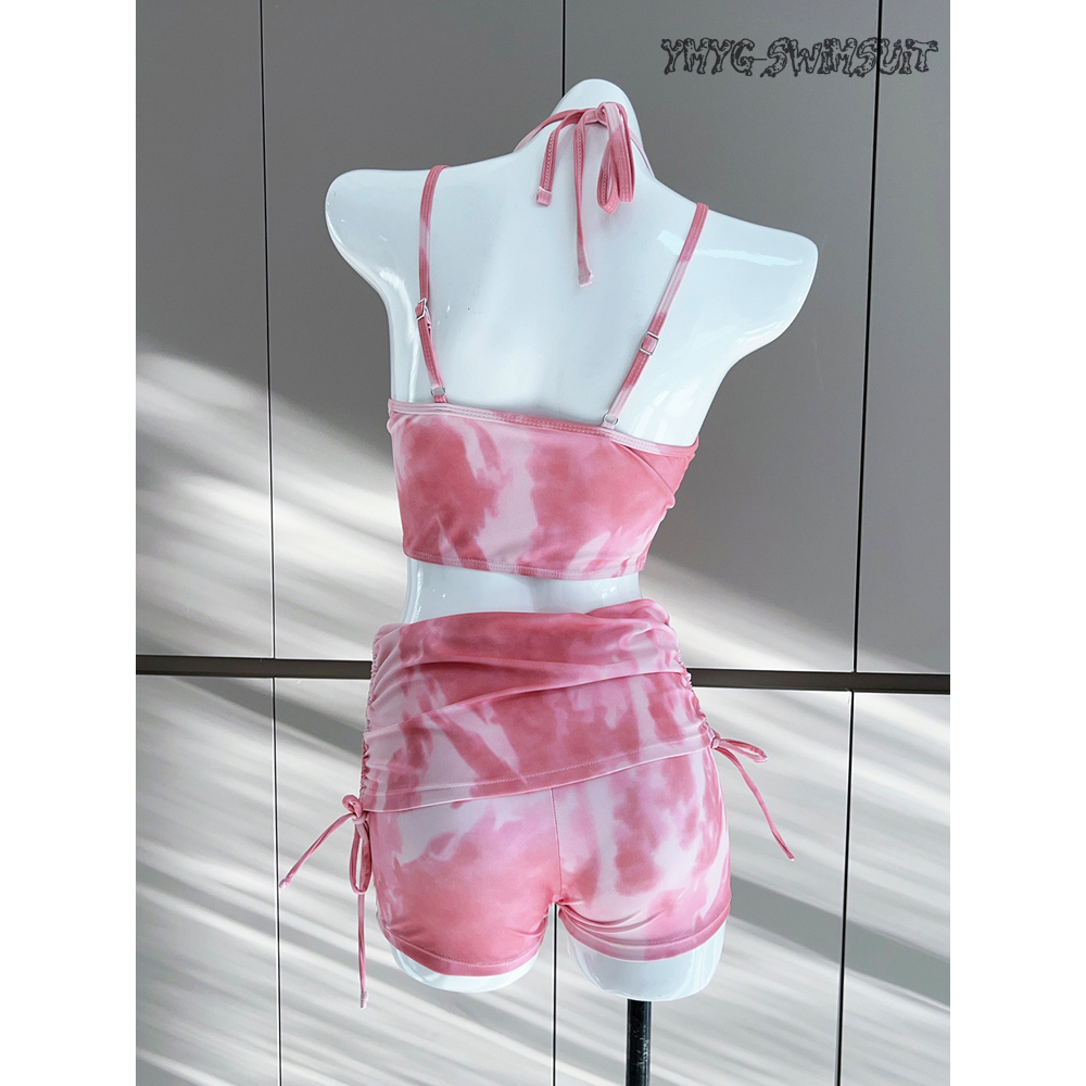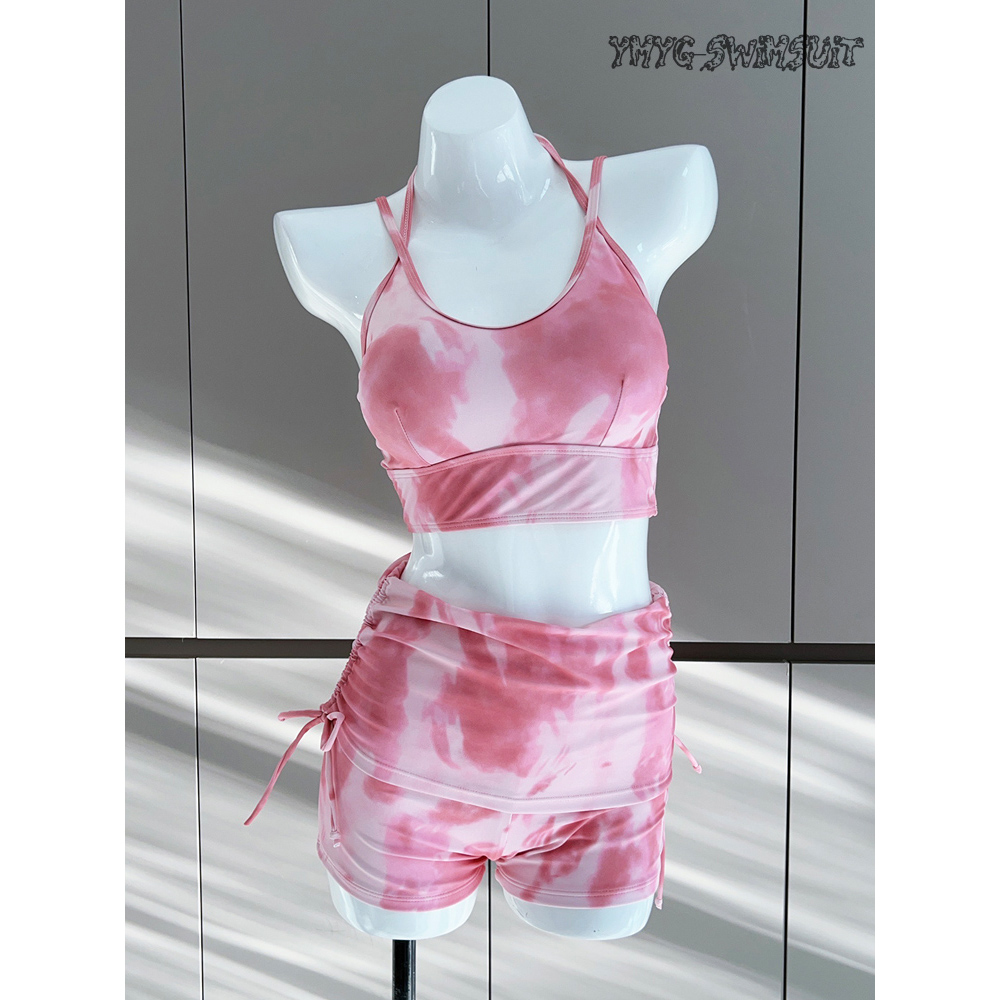 一米阳光泳衣女分体三件套可爱粉色晕染保守遮肉宽松款泡温泉泳装