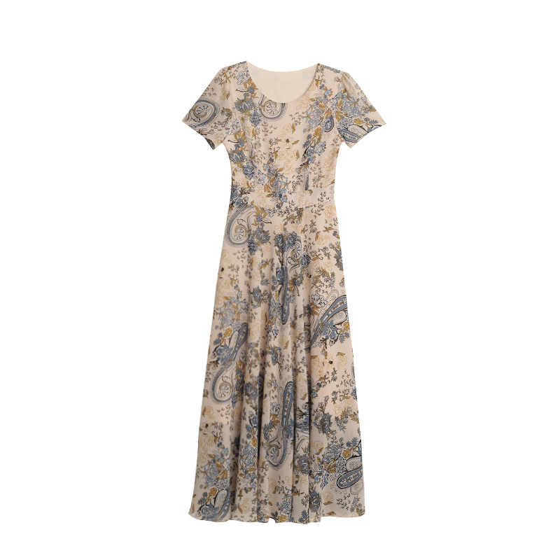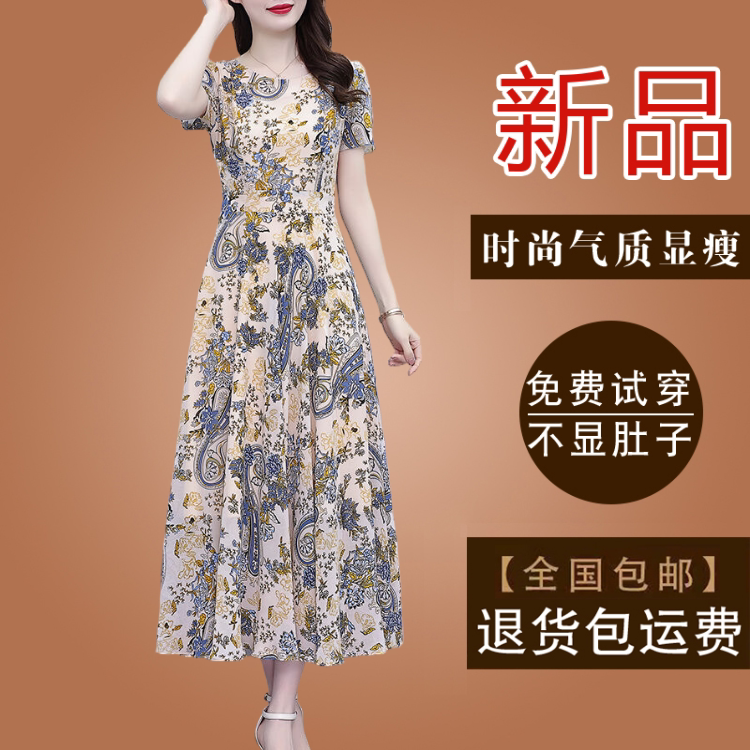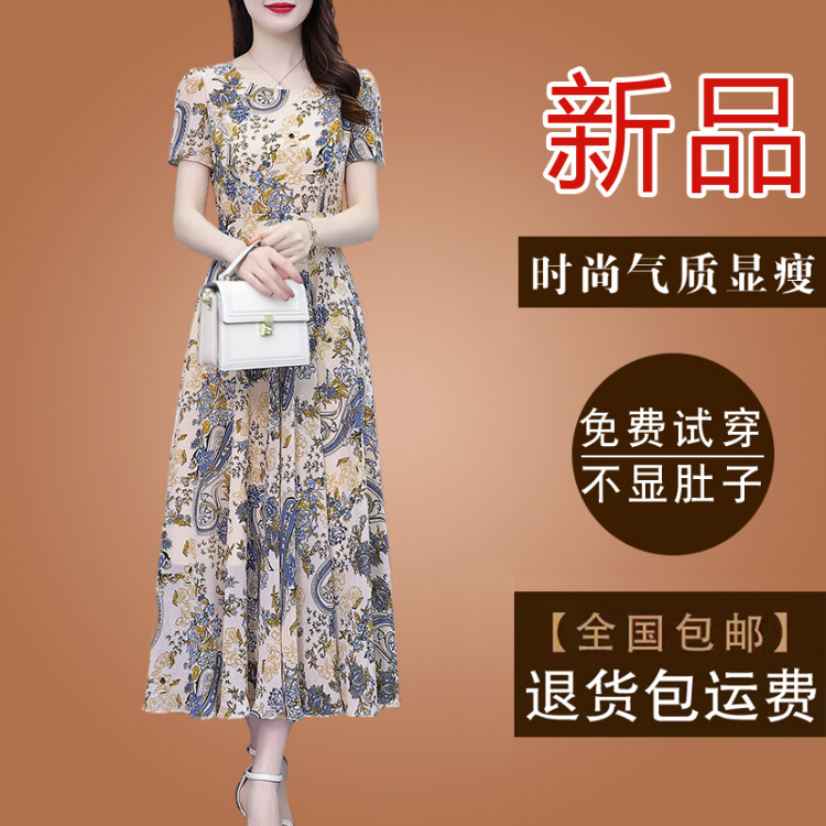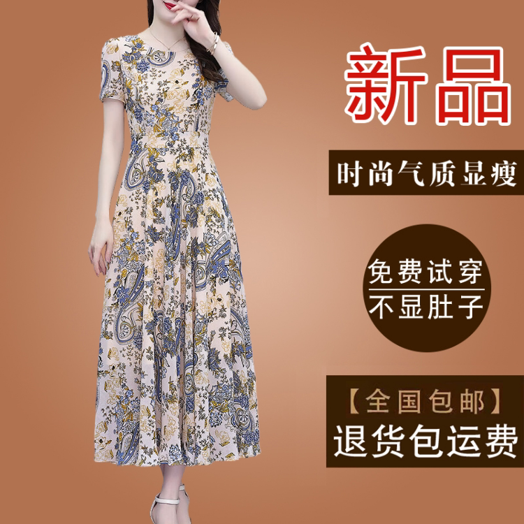 法式气质妈妈真丝雪纺碎花连衣裙女装2026夏季新款短袖妈妈装长裙