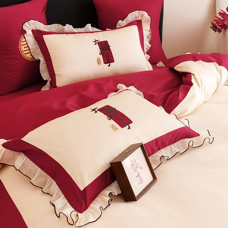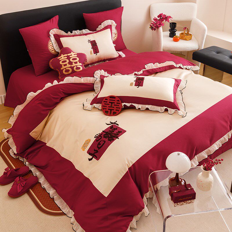 公主风结c婚床上用品四件套大红色婚庆婚房布置长绒棉床单被套