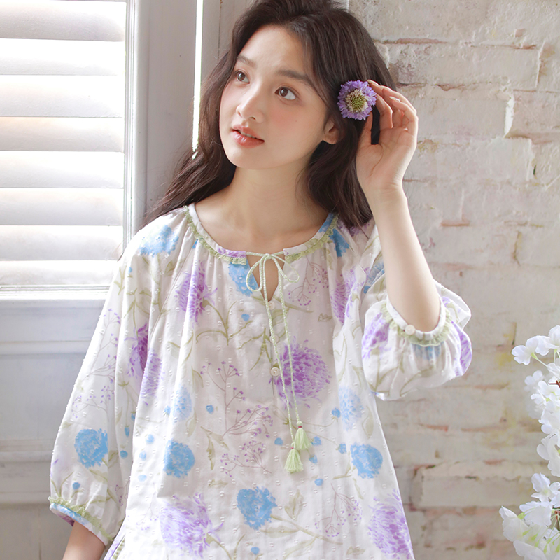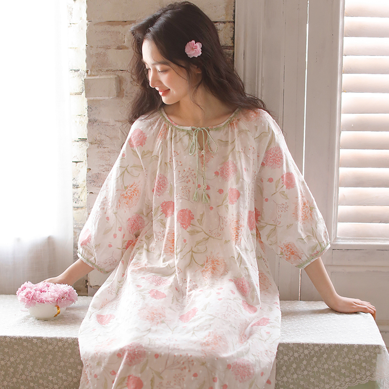 2025新款圆领夏季V领睡裙女纯棉中袖睡衣连衣裙印花可外穿家居服