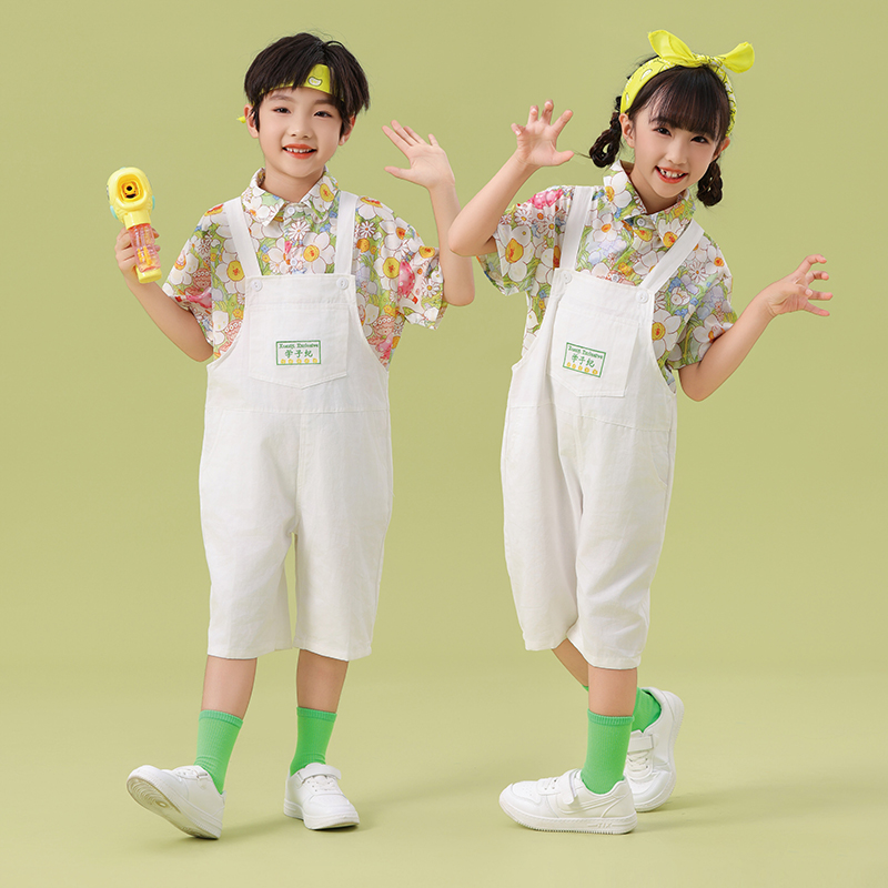儿童花衬衫背带裤演出服幼儿园舞蹈服小学生运动会啦啦队服合唱服