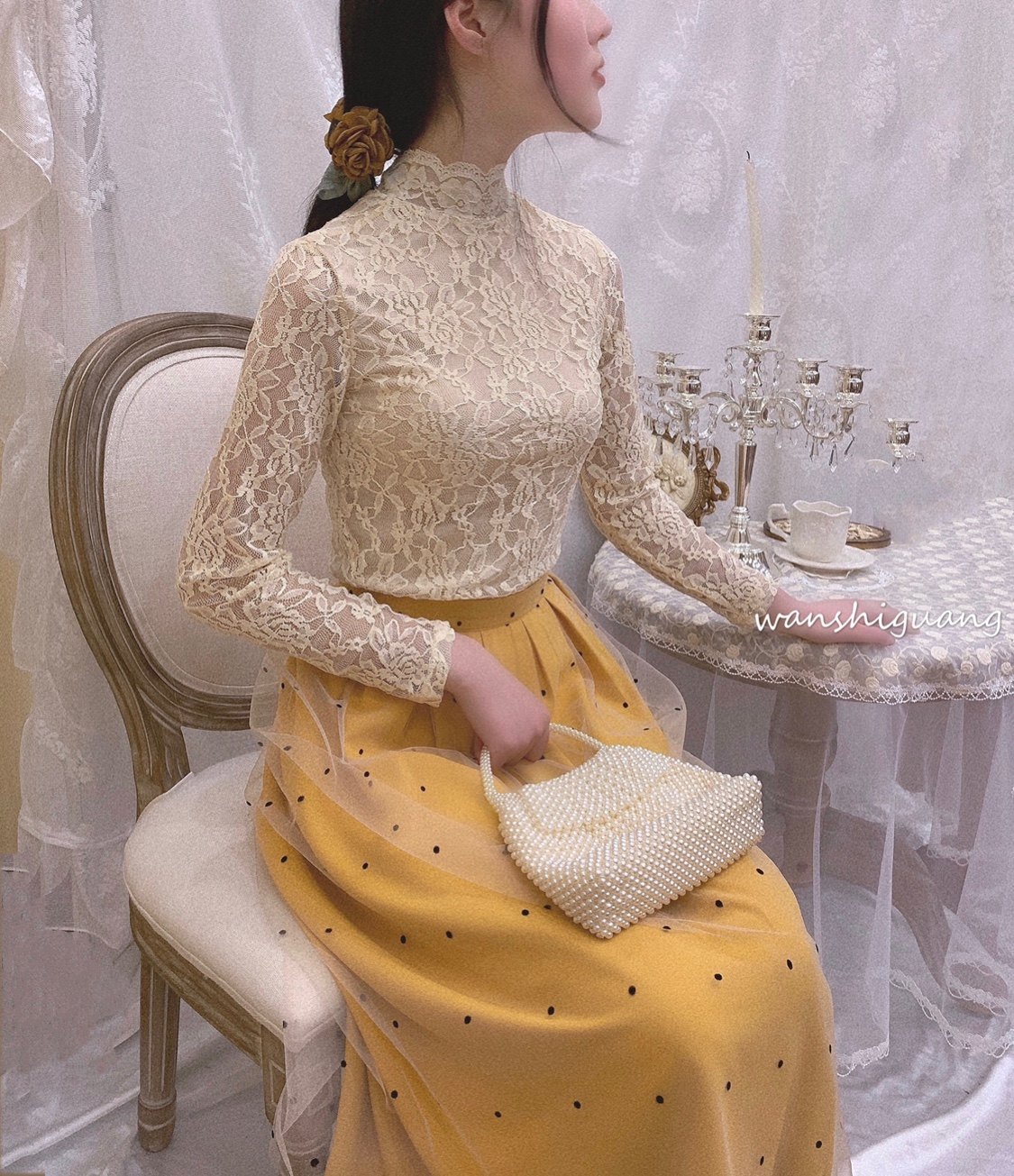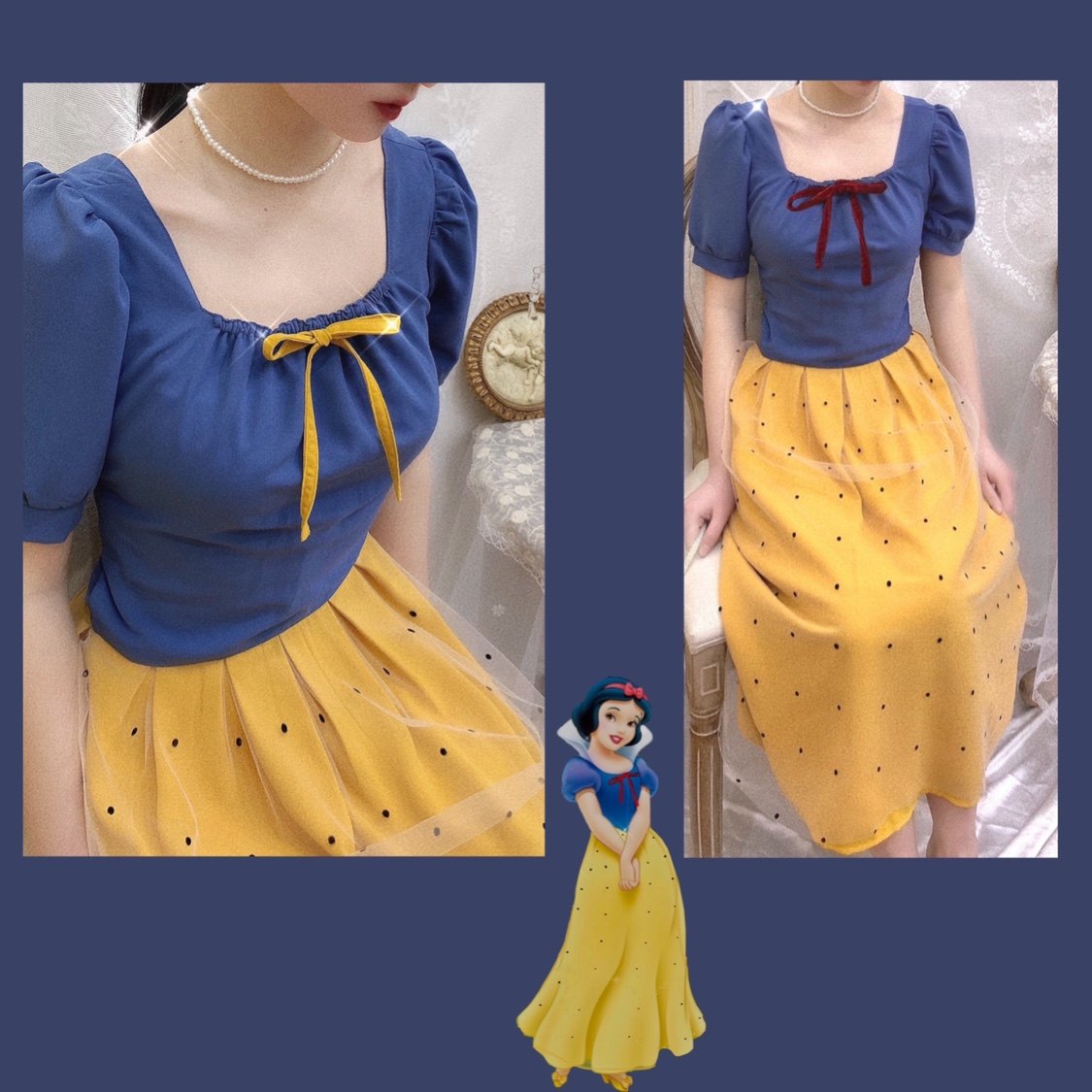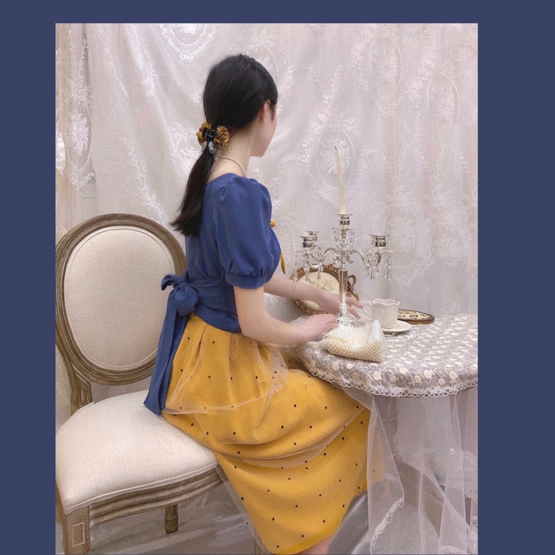 晚时光 秒杀白雪公主风蓝色方领蝴蝶短袖高腰黄色网纱波点半身裙