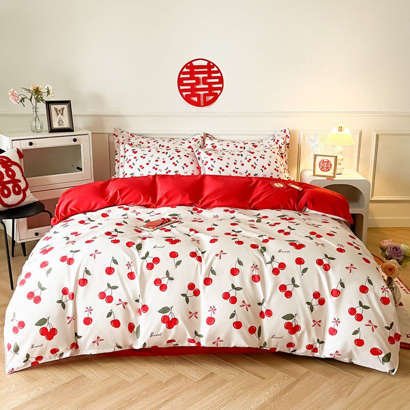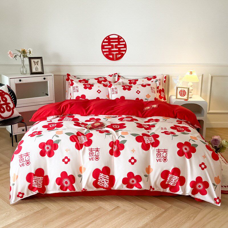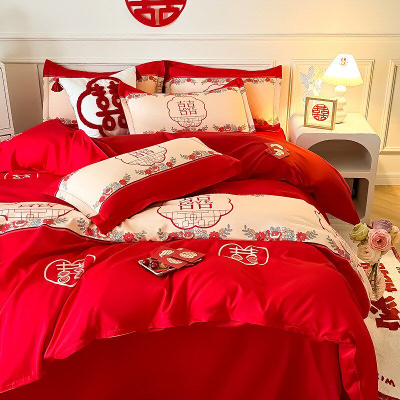 大红刺绣婚庆四件套床绣花被套床单三件套中式喜庆结婚床上用品