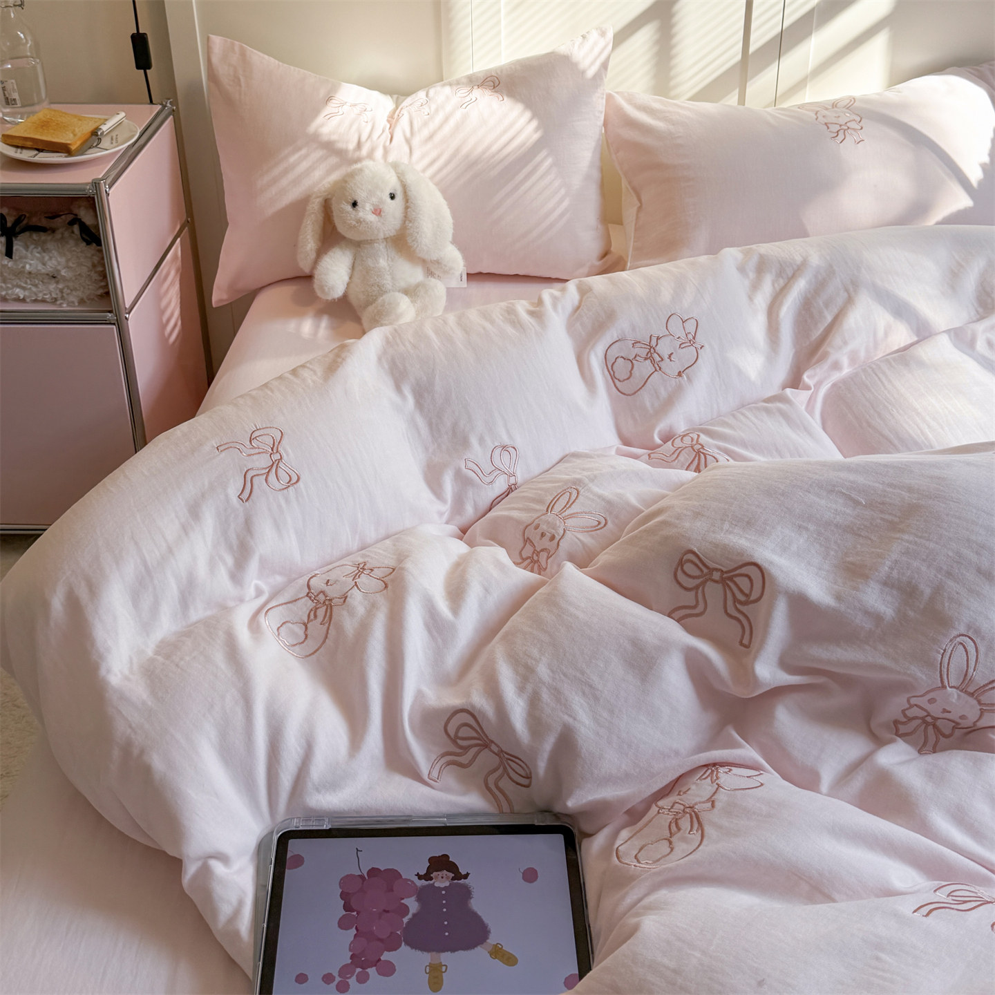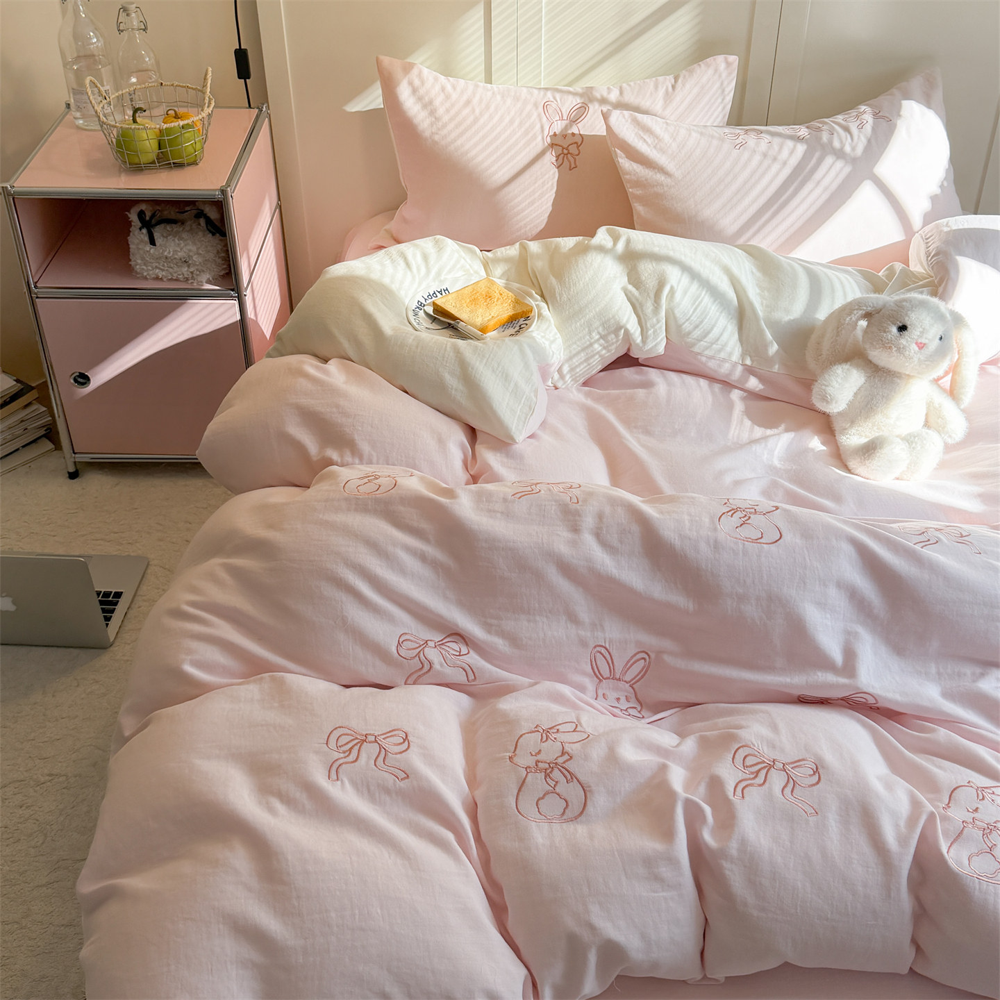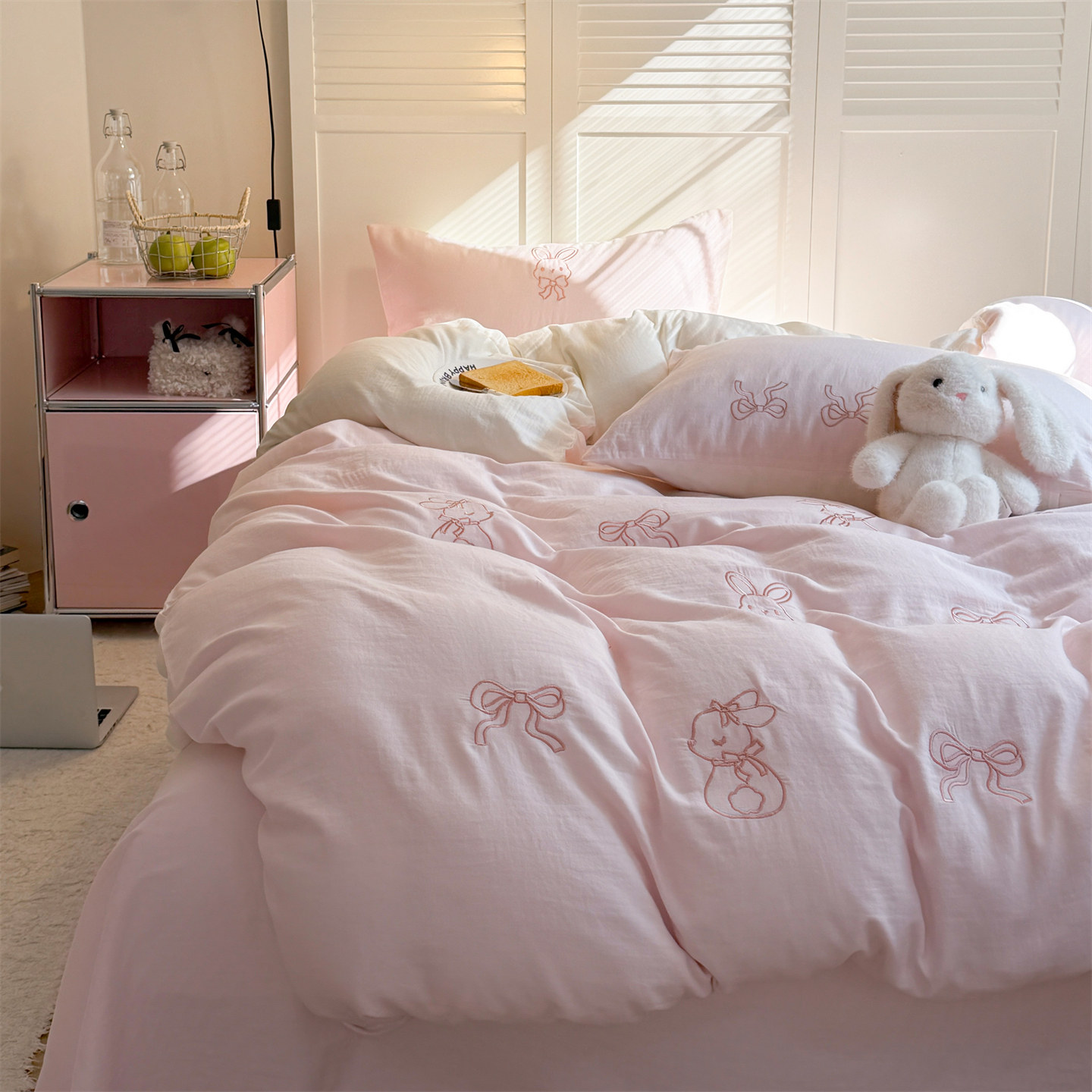 ins风简约儿童卡通小兔双层纱四件套 纯棉柔软刺绣清新奶油风床品