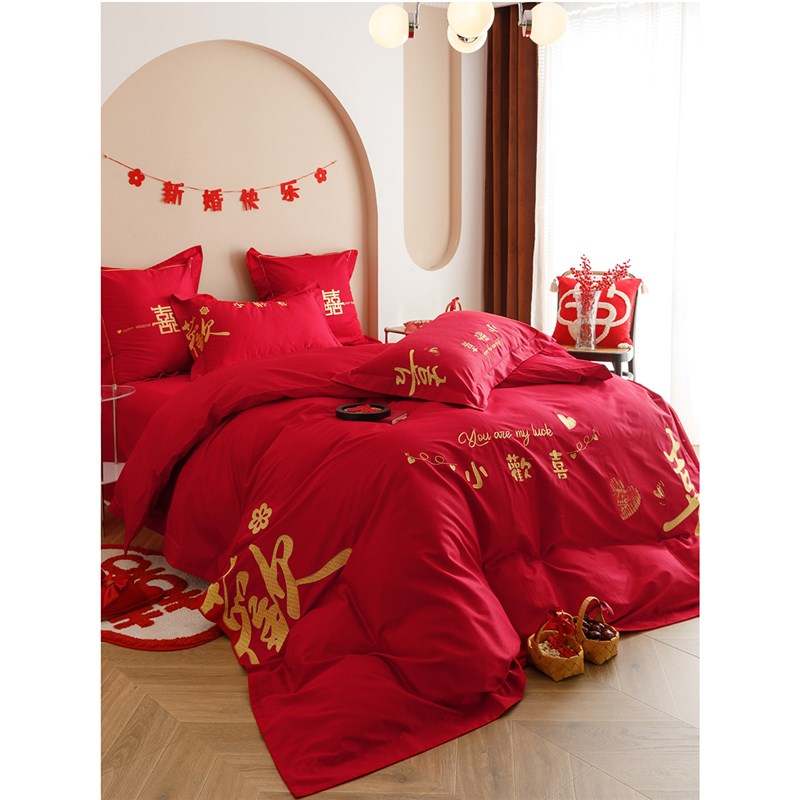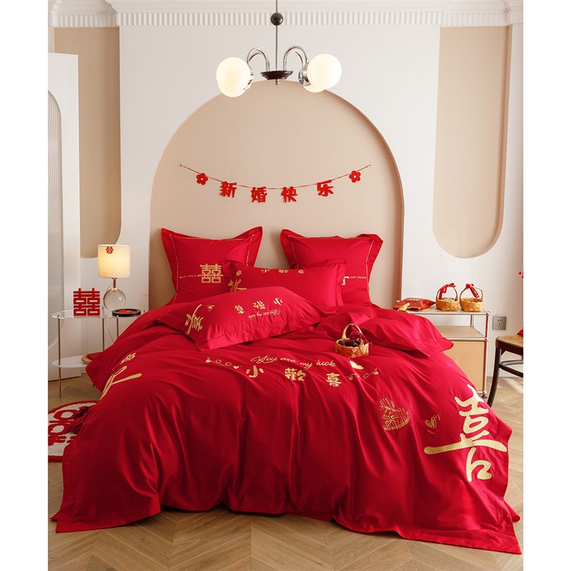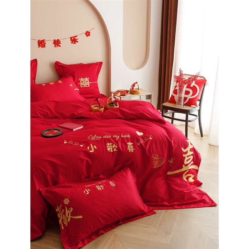 结婚床上用品四件套婚庆红色婚房喜被简约高级感喜字刺绣被套床单