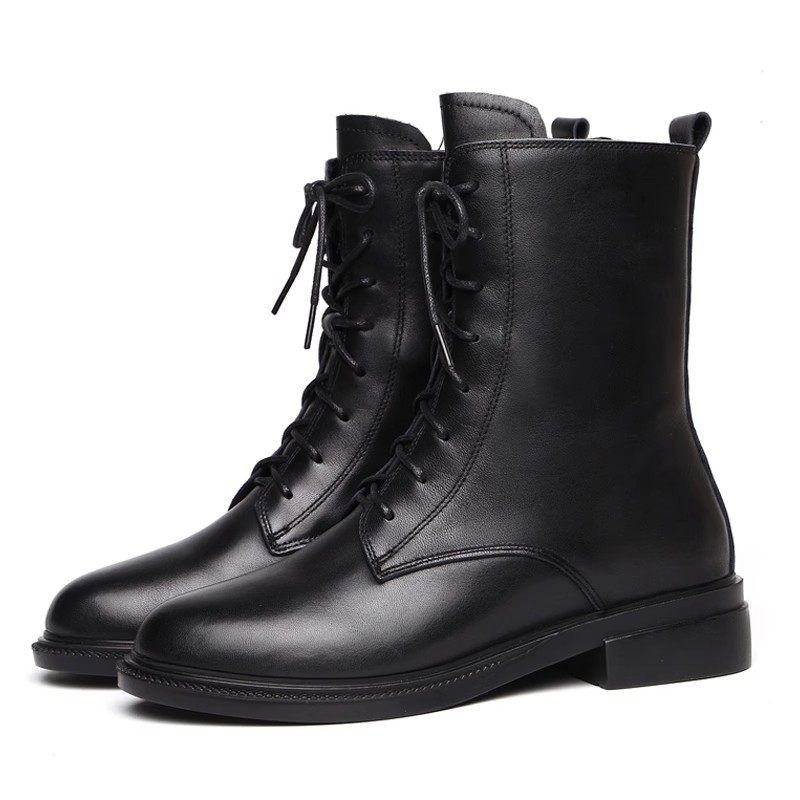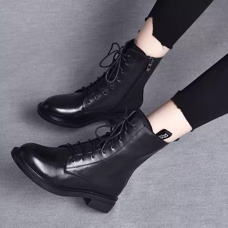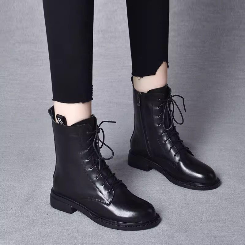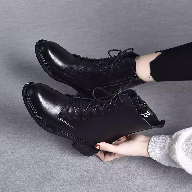 意大利原创真皮系带马丁靴女2025冬季新款加绒黑色大方短靴平底靴