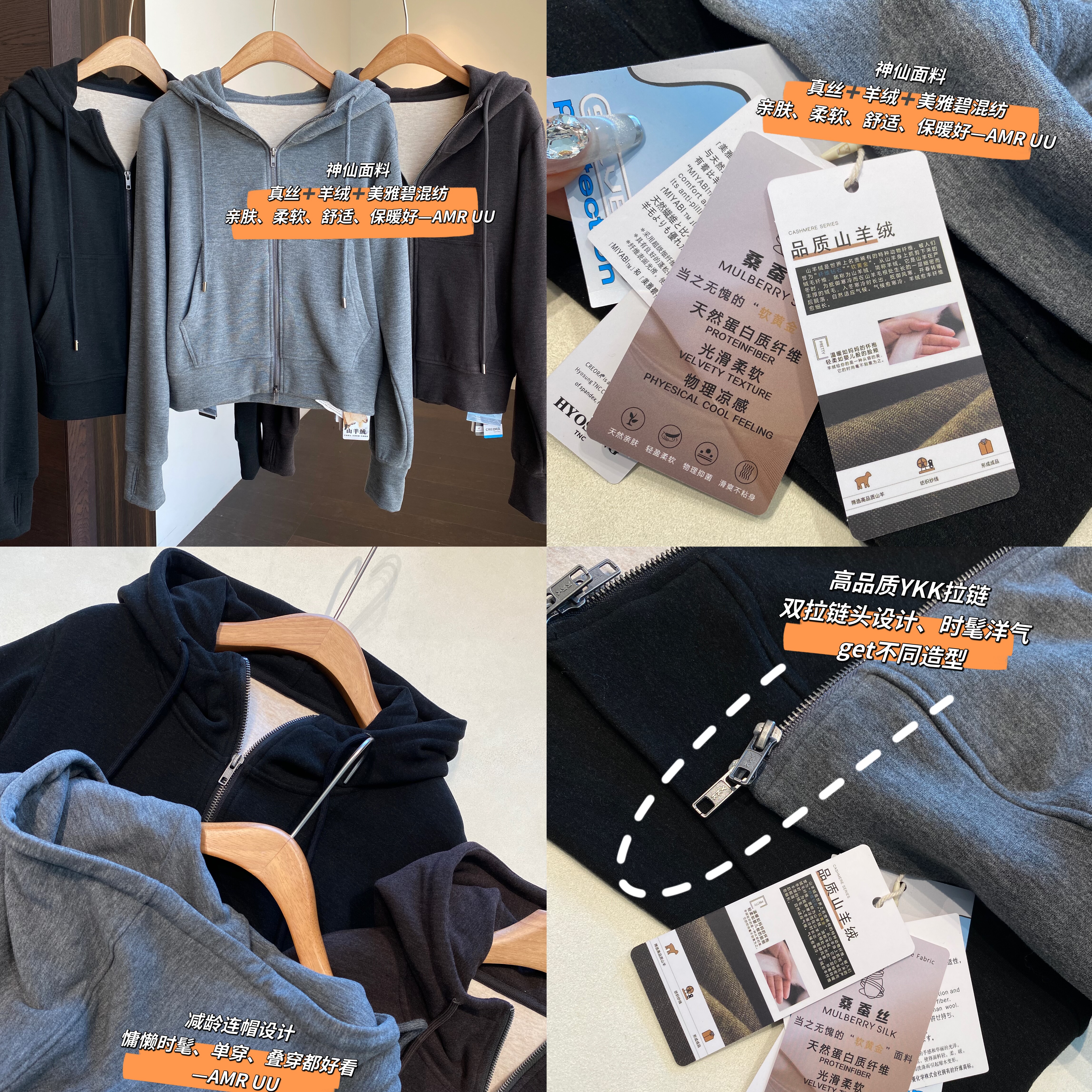 AMR UU◆重磅真丝羊绒保暖舒适厚实百搭连帽上衣外套女卫衣秋冬新