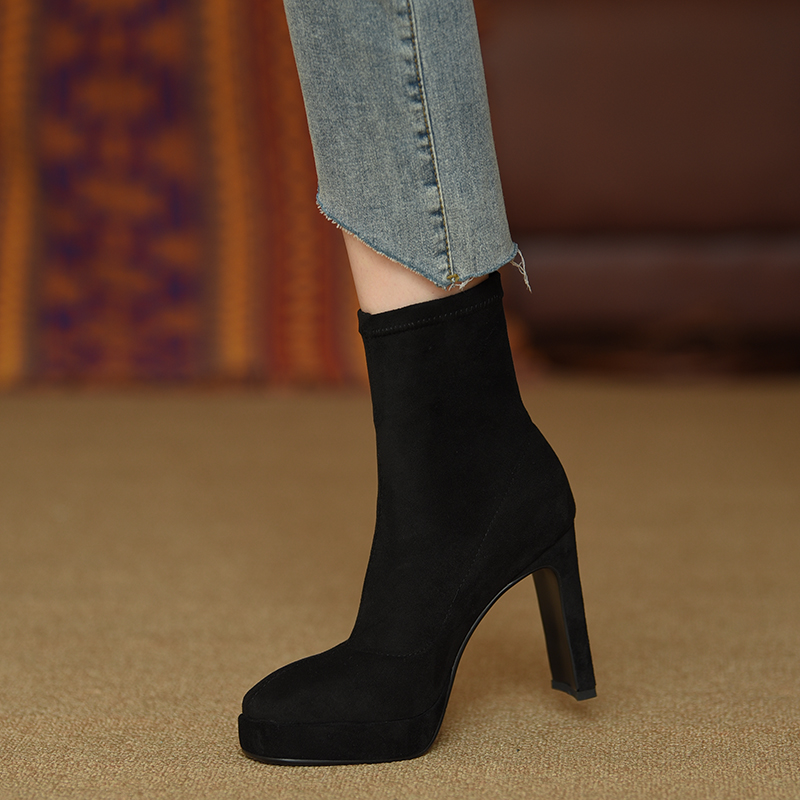 防水台弹力磨砂高跟加绒瘦瘦靴
