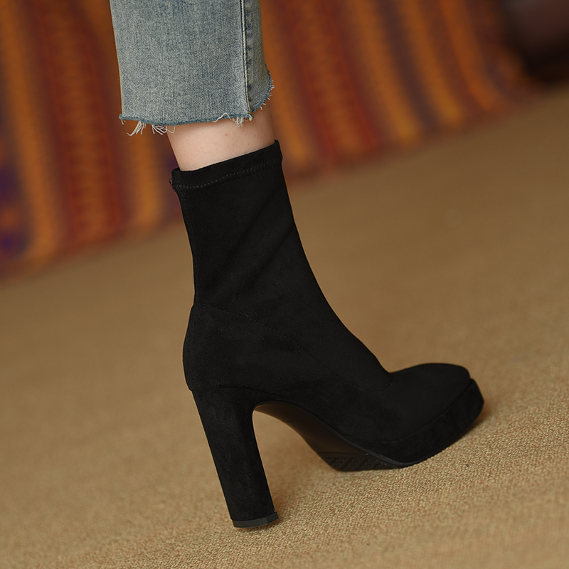 misili 防水台弹力瘦瘦靴2024秋冬新款磨砂粗跟短靴高跟加绒女靴