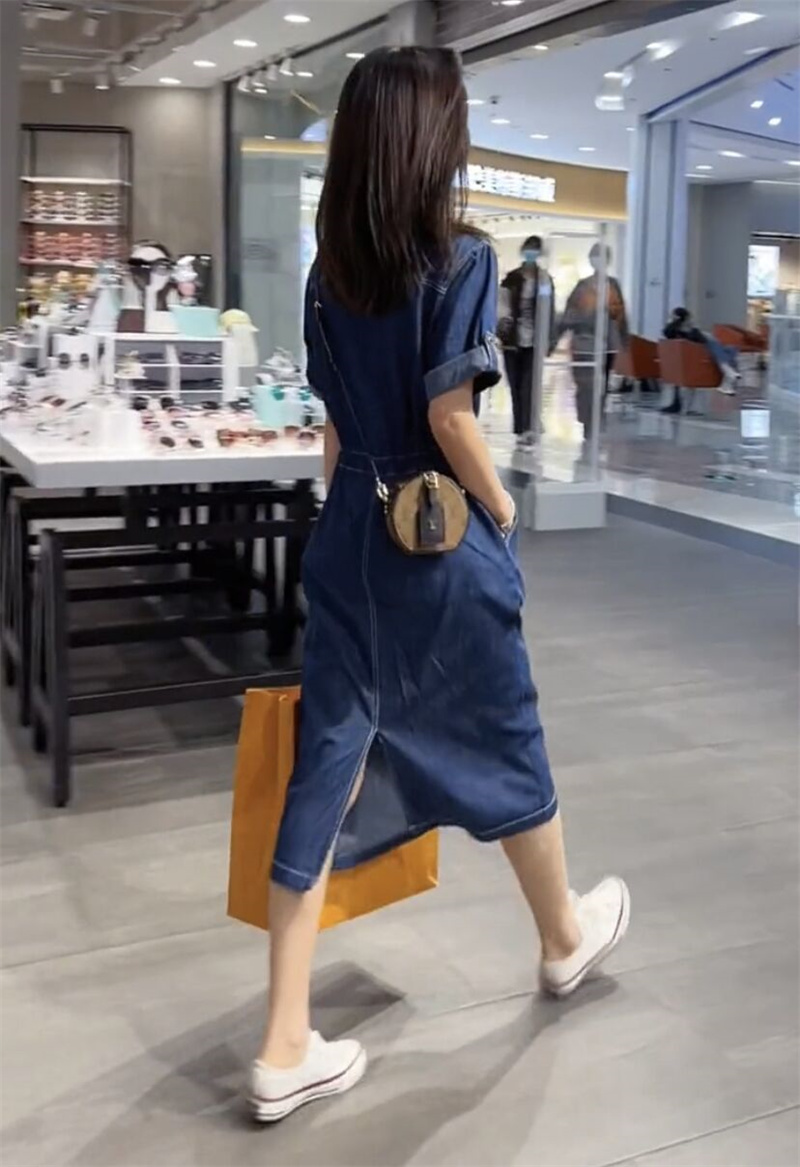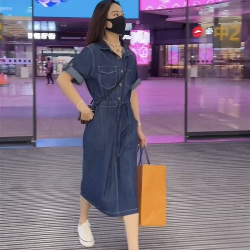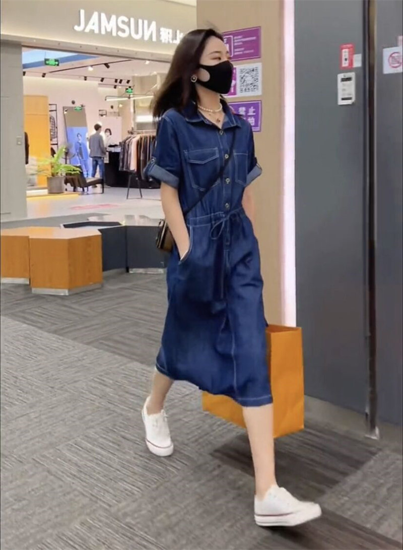 正品薄款天丝牛仔连衣裙女2025夏季新款收腰显瘦中长款牛仔裙长裙