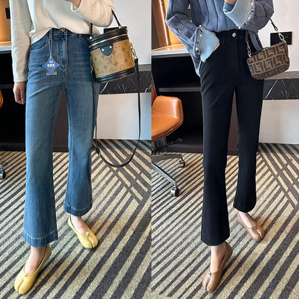 四面弹高腰黑色九分微喇裤女春夏季修身显瘦百搭喇叭牛仔裤小个子