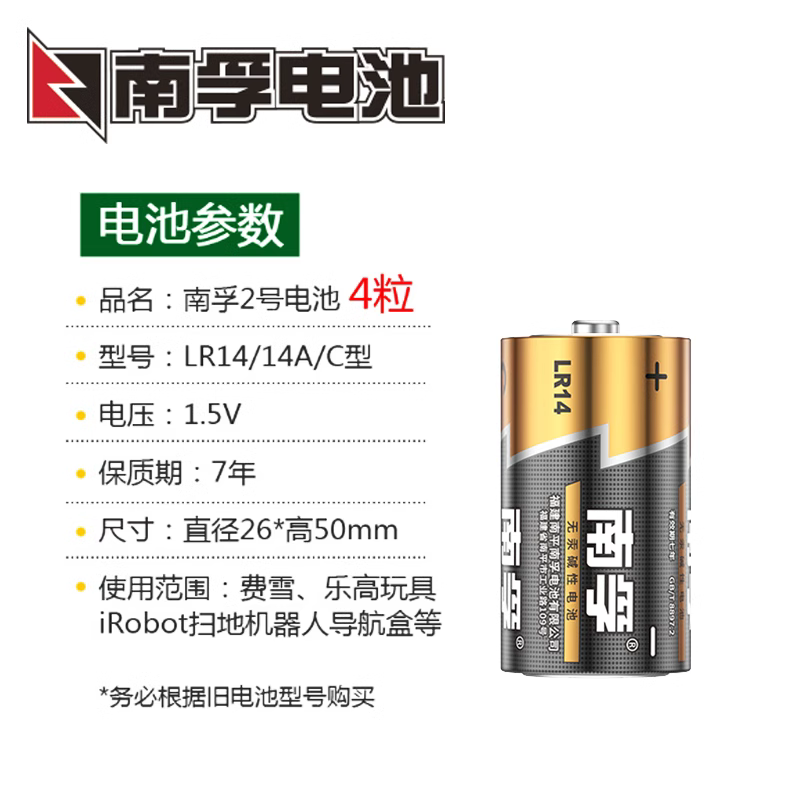 南孚碱性2号C型LR14电池中二号面包超人淋浴花洒费雪摇椅玩具钟表