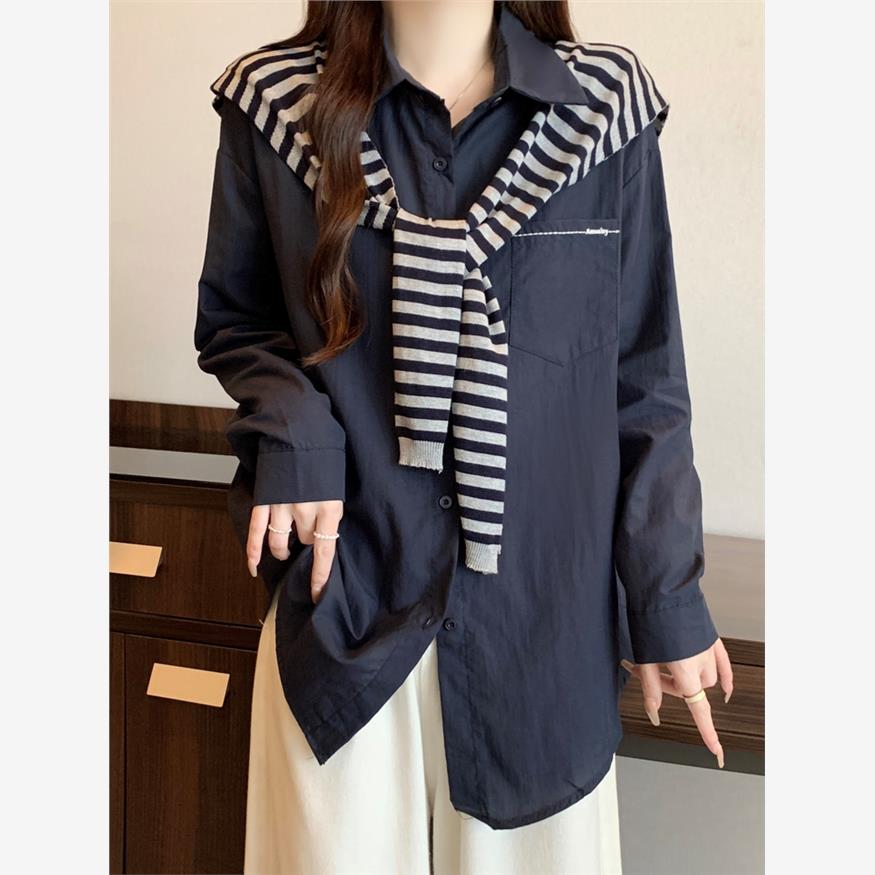 香衣儿大码女装秋冬新款胖mm宽松时尚韩版衬衫+条纹披肩两件套