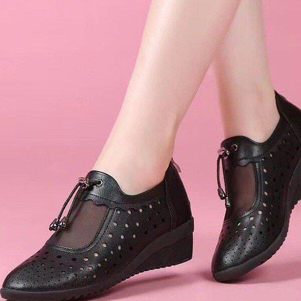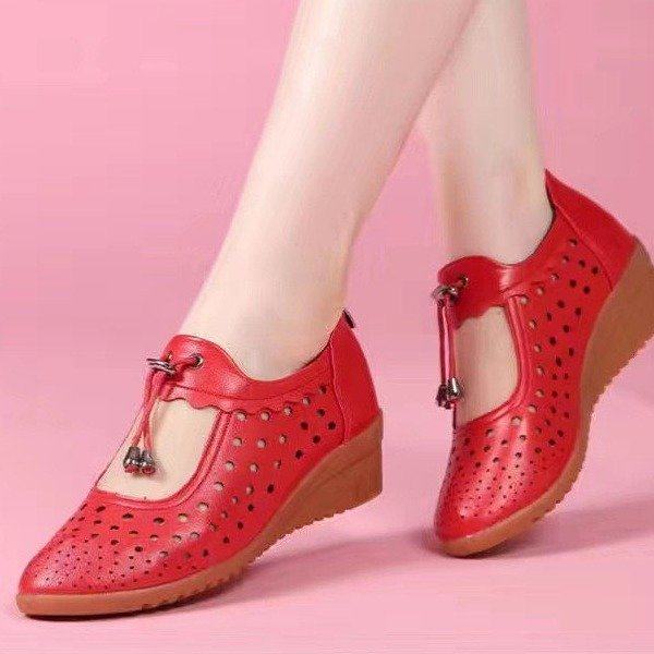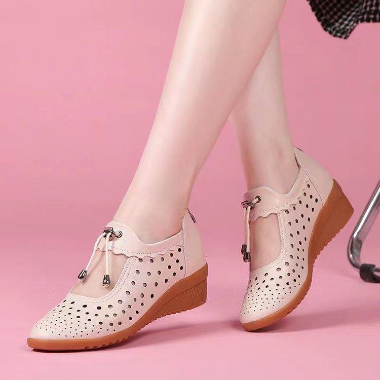 大东妞清仓妈妈鞋坡跟镂空女单鞋春夏广场舞蹈真皮软底透气洞洞鞋