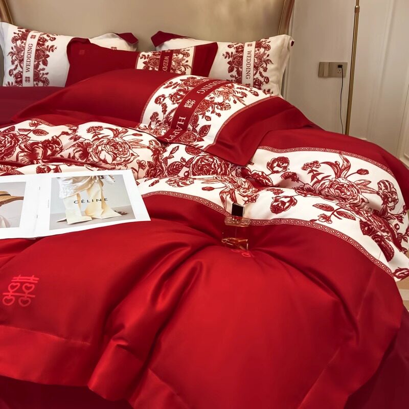 中式结婚四件套大红色床单被套全棉婚庆床上用品婚房婚嫁