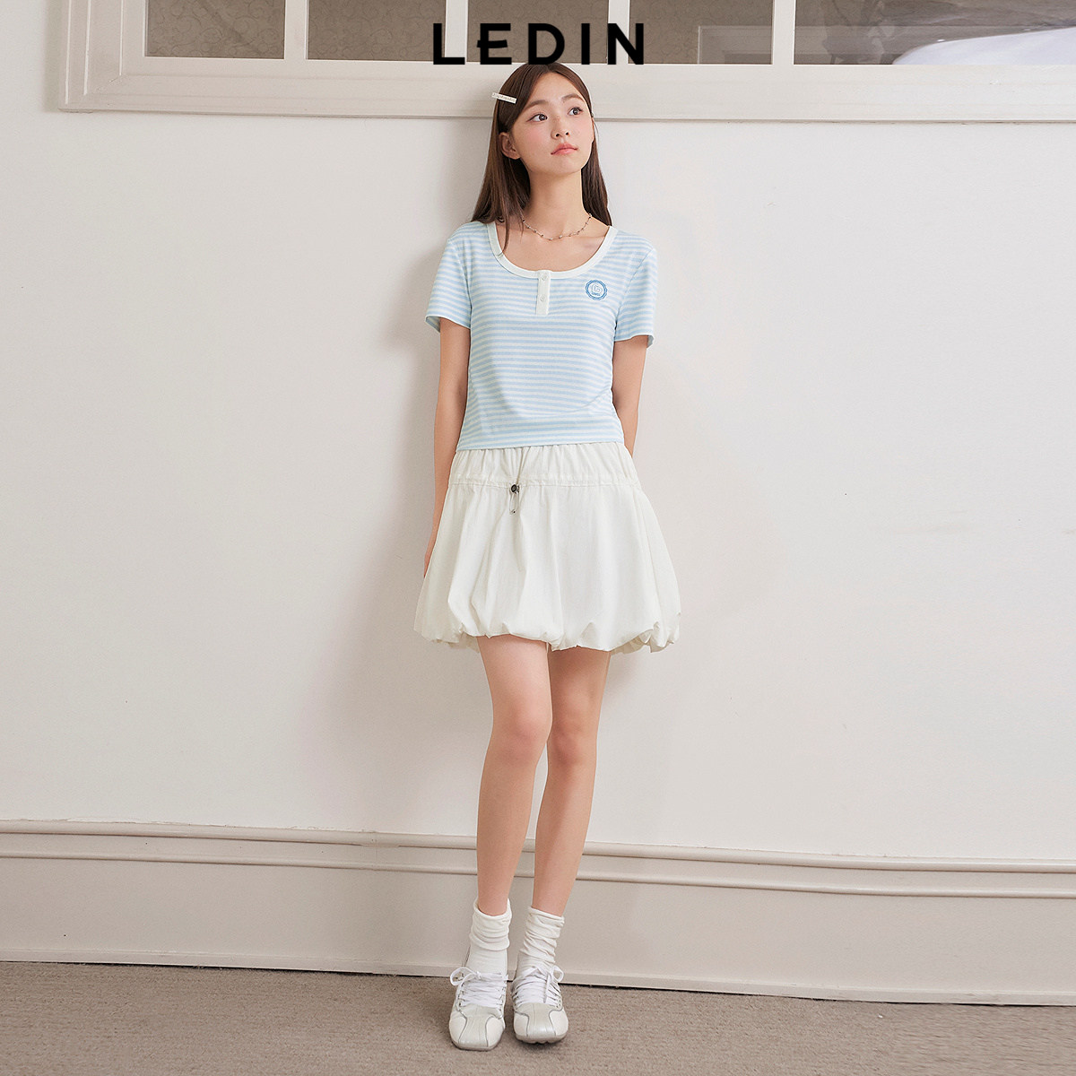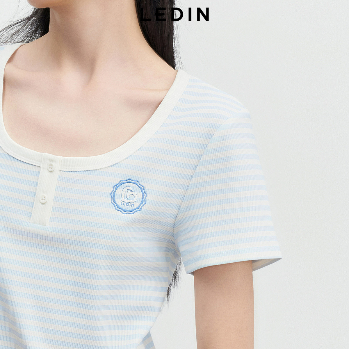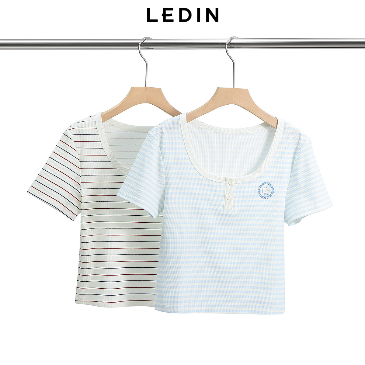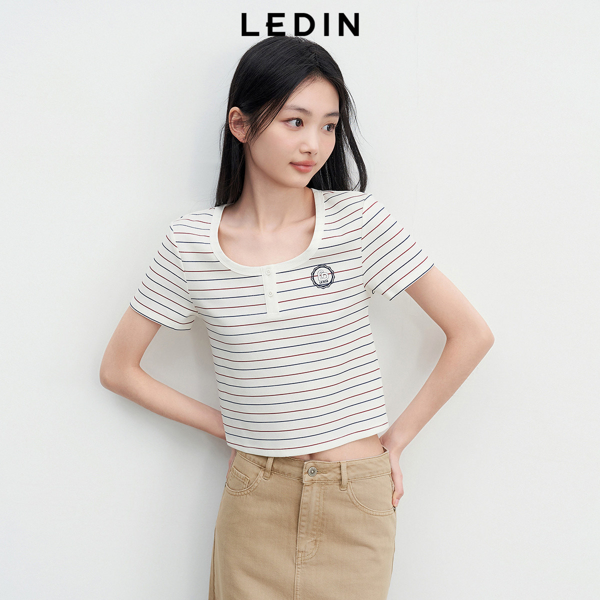 乐町撞色条纹大U领修身短袖25年夏季新款女装辣妹HOT弹力截短T恤