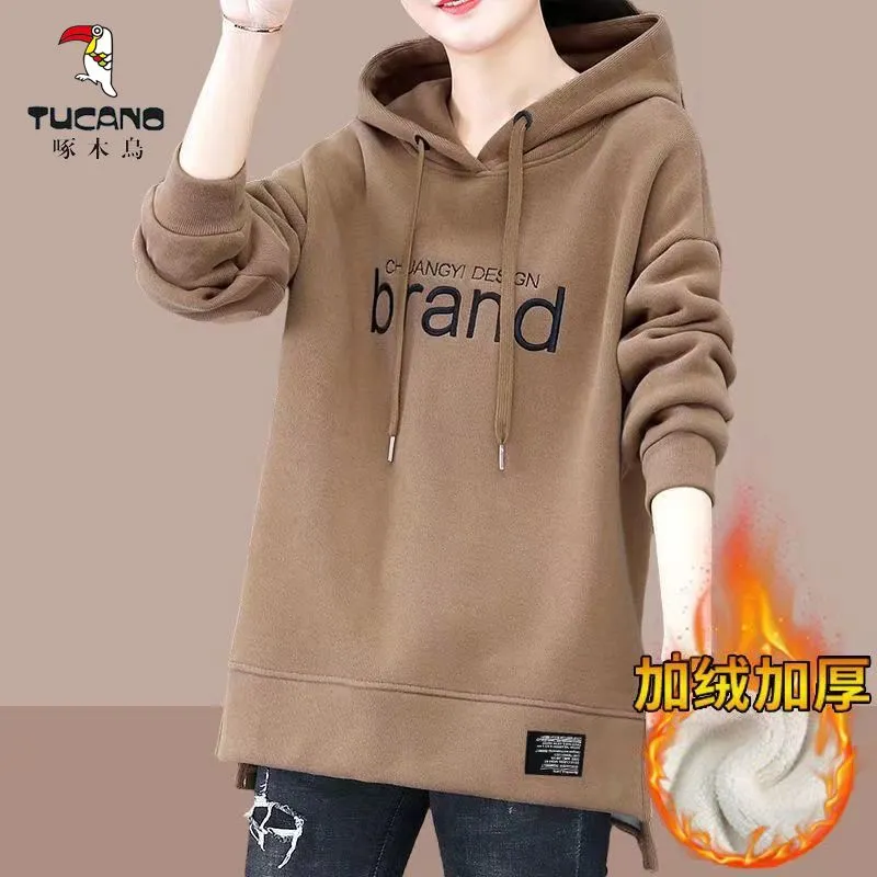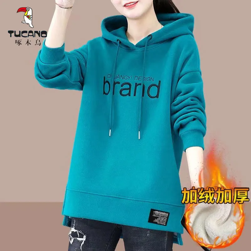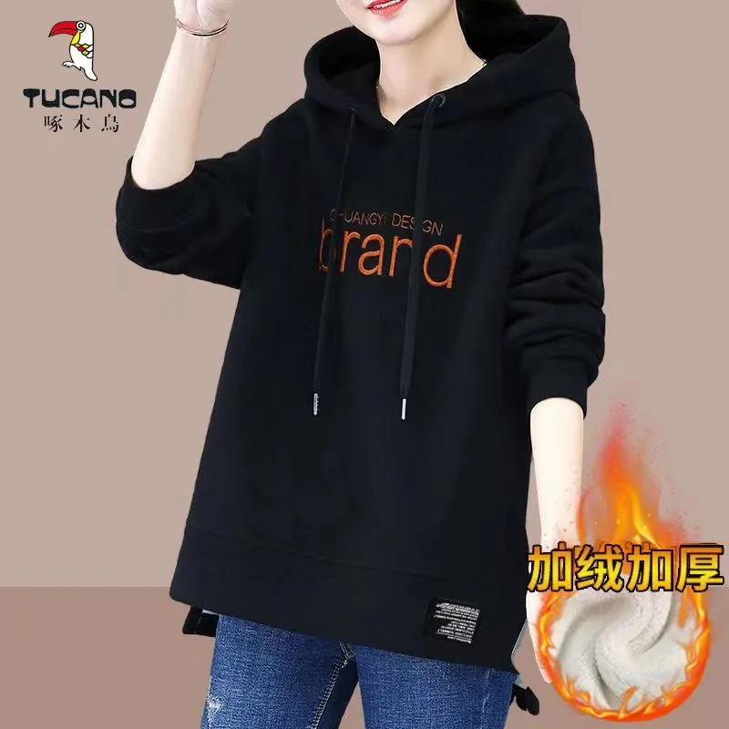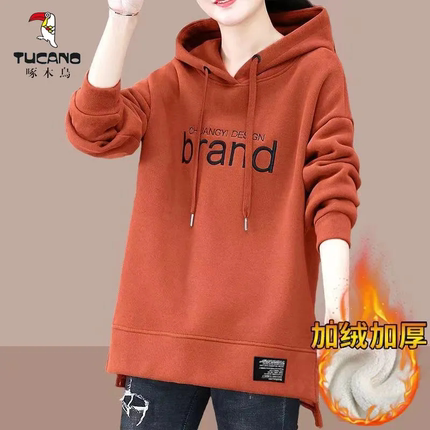 啄木鸟连帽卫衣女2025秋冬季新款加绒加厚保暖上衣宽松显瘦妈妈装