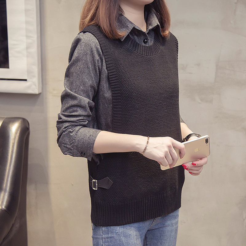 秋冬洋气打底针织背心假两件上衣胖mm大码女装 200斤毛衣衬衫外套