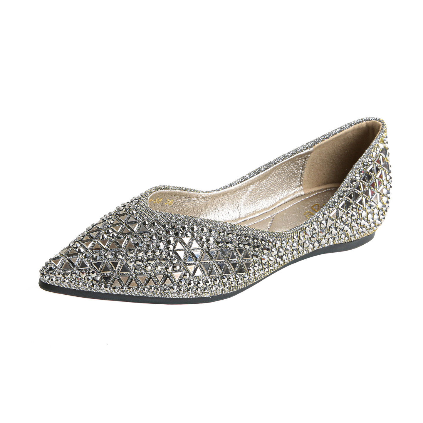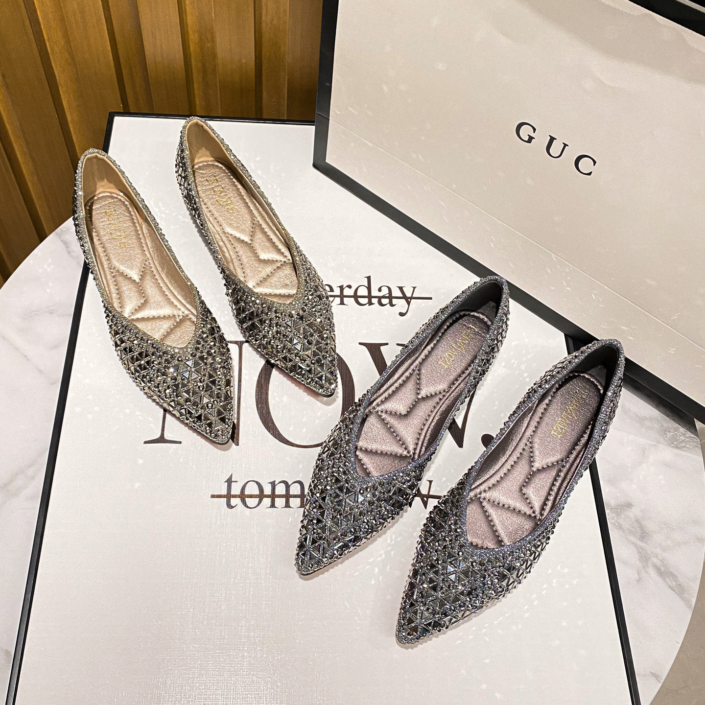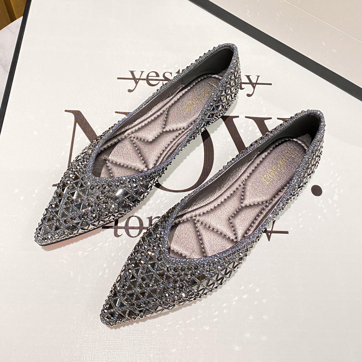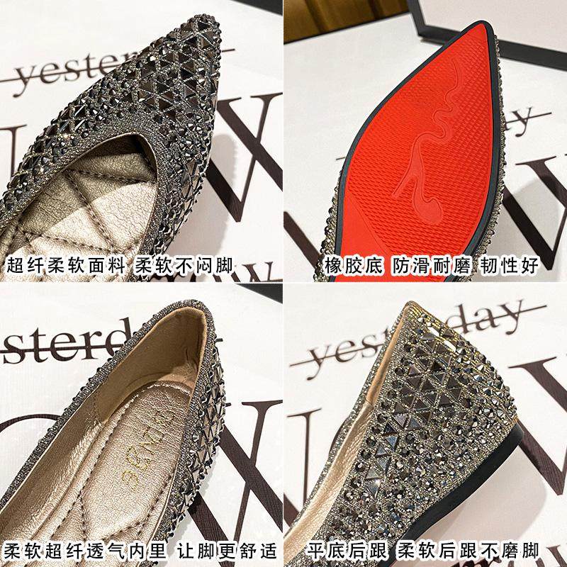 平底单鞋女2026春季新款尖头水钻亮片瓢鞋浅口软底大码41到43船鞋
