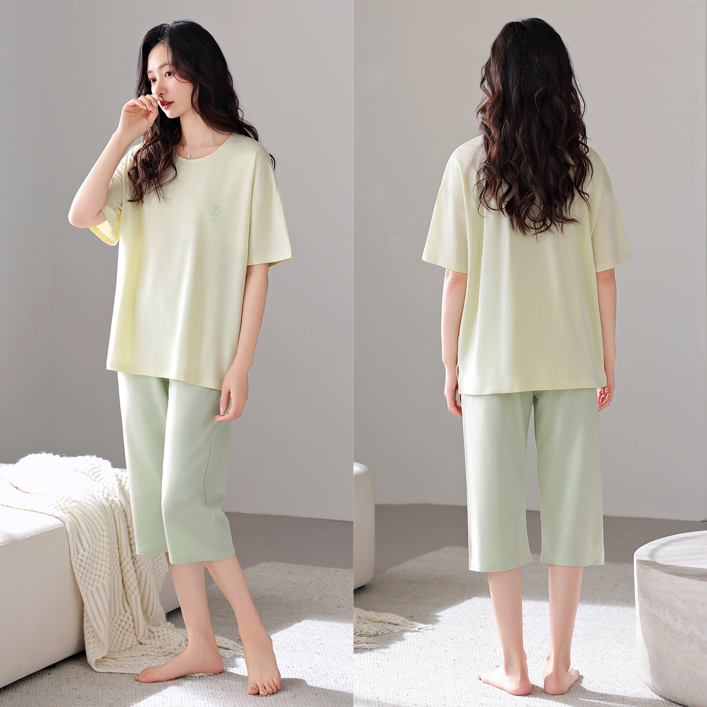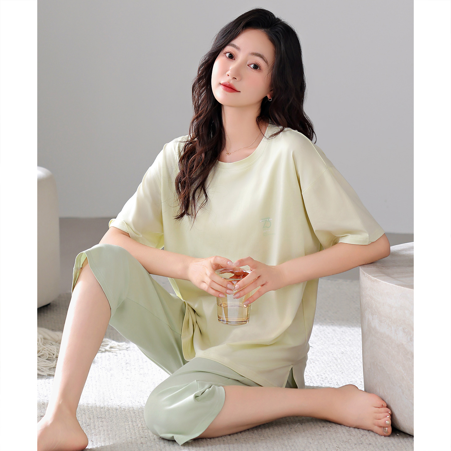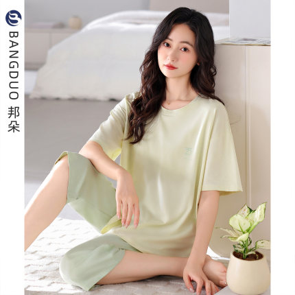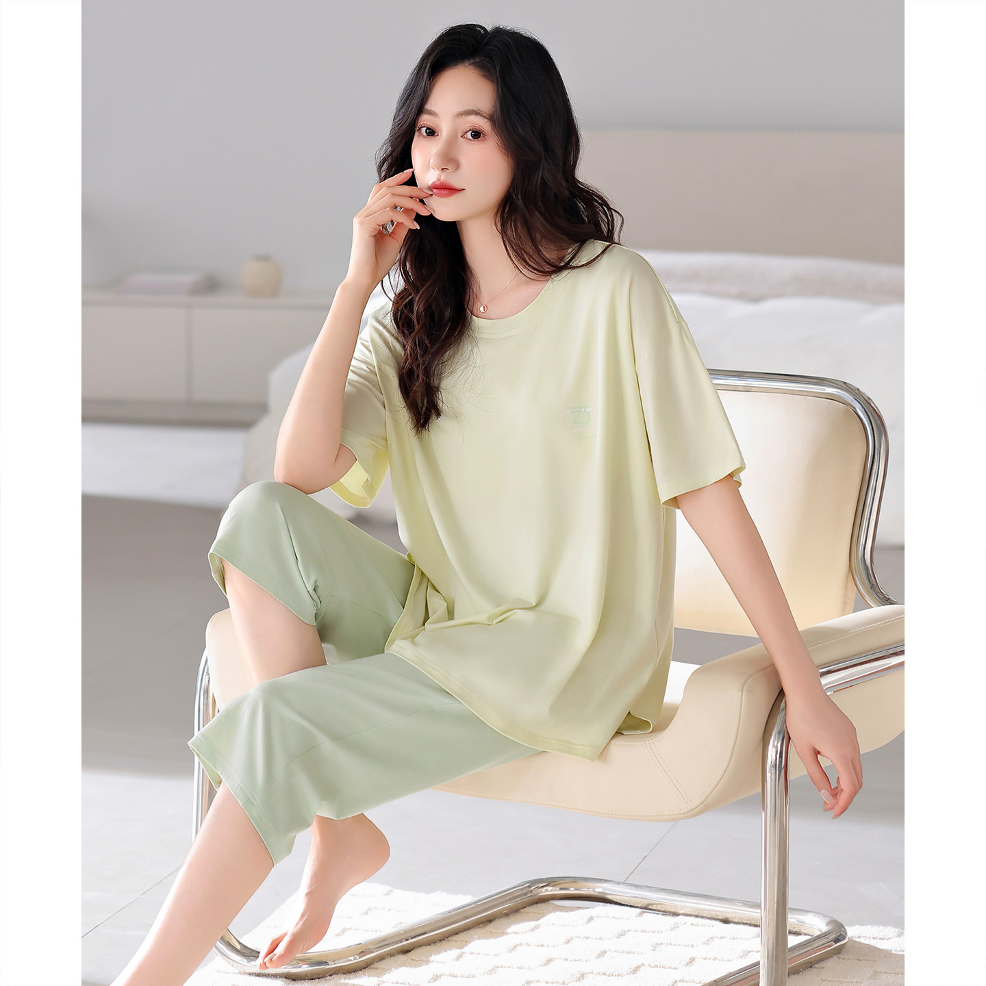 带胸垫睡衣女夏季莫代尔短袖七分裤薄款冰丝可外穿夏款半袖家居服