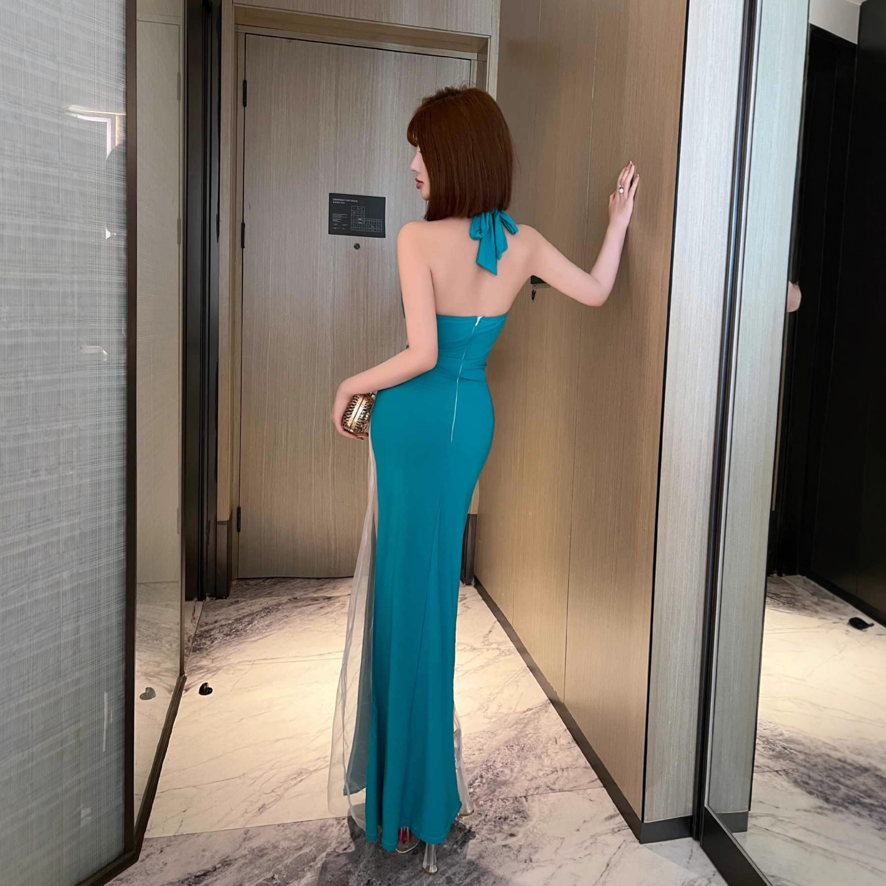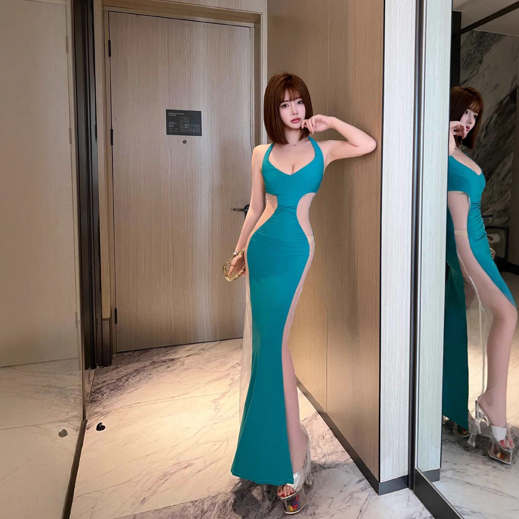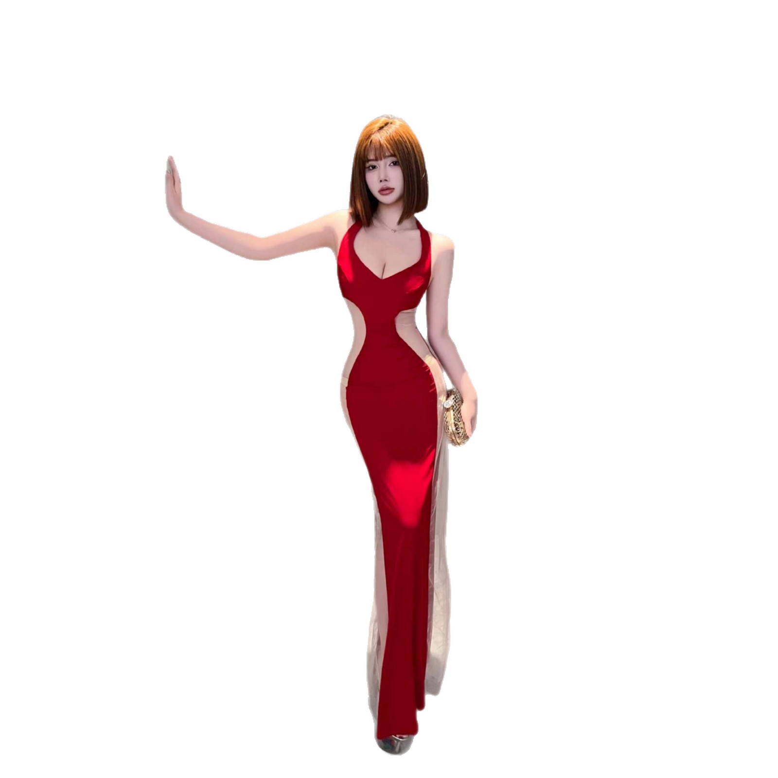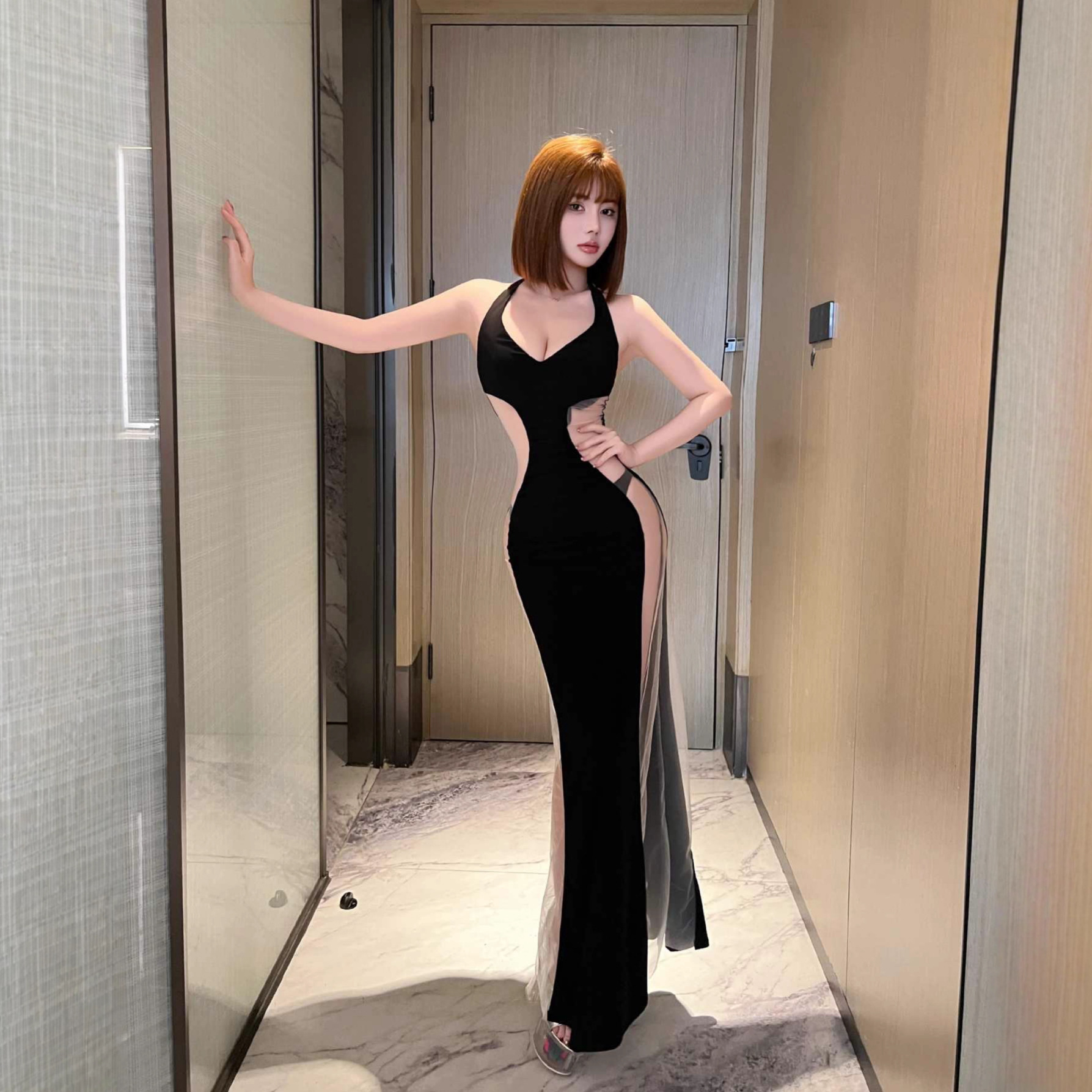 夜总会连衣裙女夜场性感V领网纱露背挂脖长裙气质修身显瘦晚礼服
