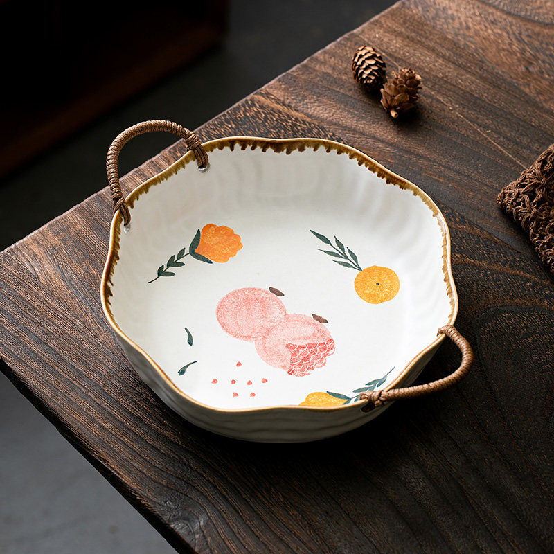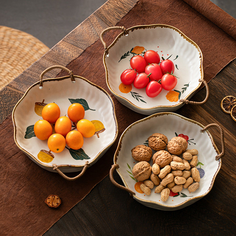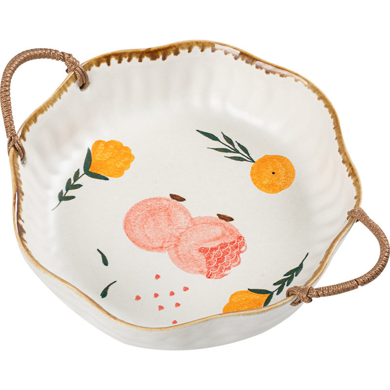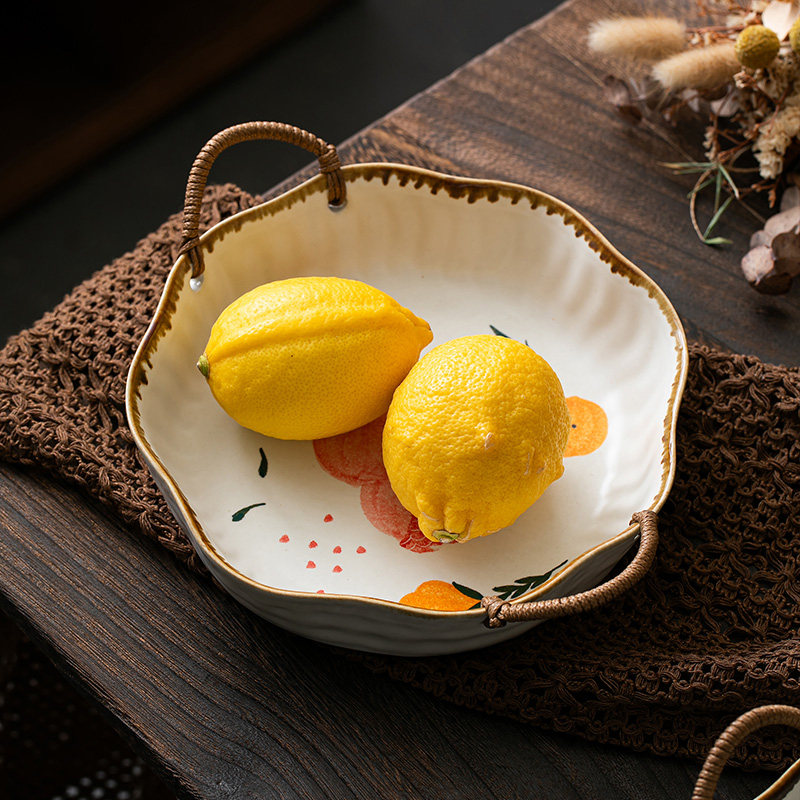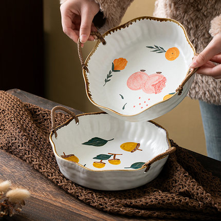 景德镇田园复古手绘釉下彩植物提篮果盘双耳花卉水果盘陶瓷水果篮