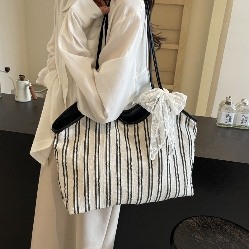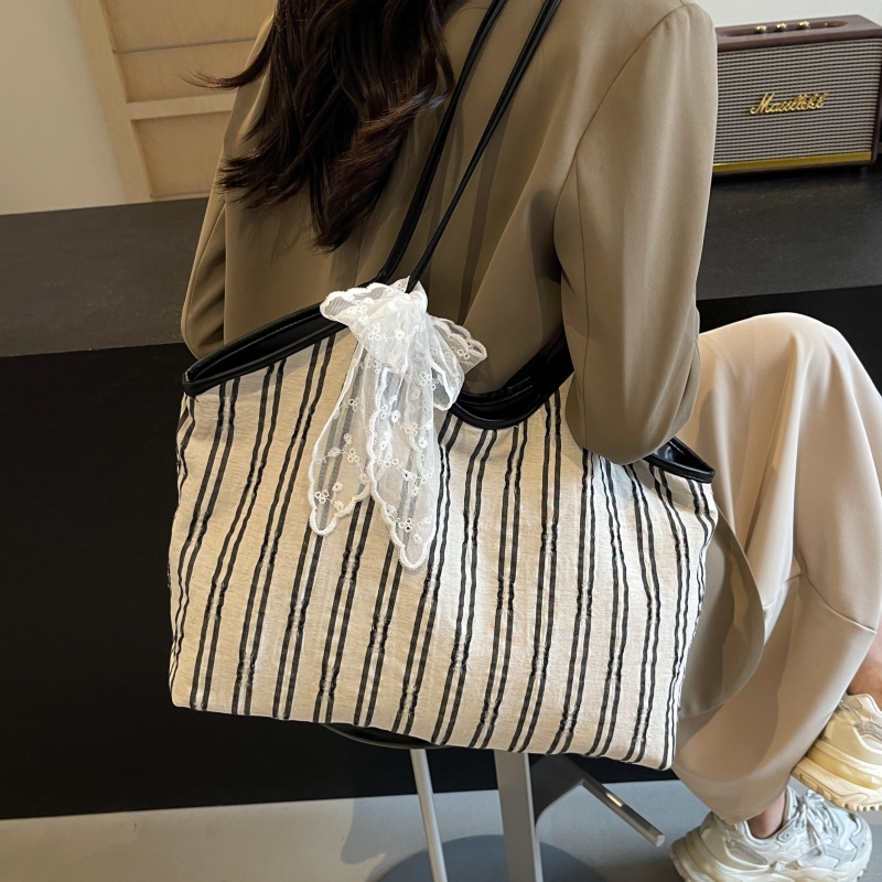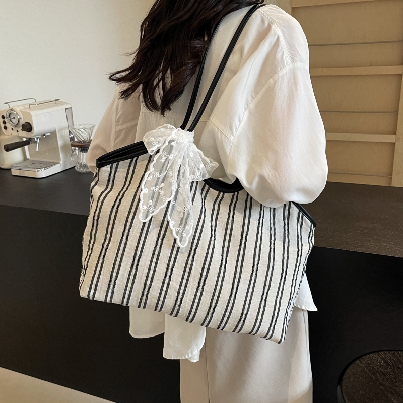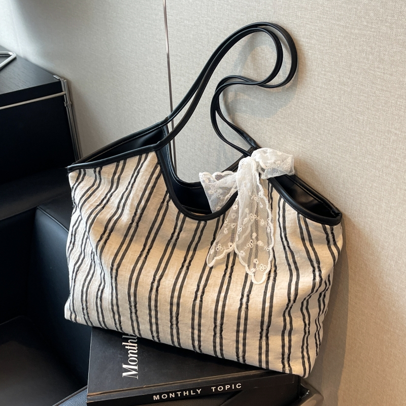 夏季条纹帆布包包女韩版大容量单肩腋下包小众设计上课通勤托特包