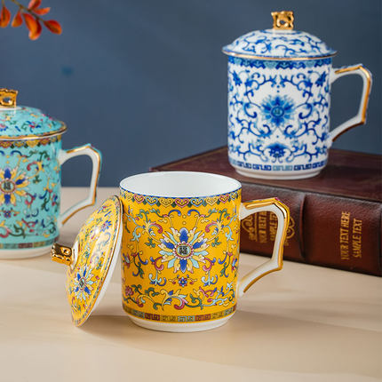 景德镇中式青花珐琅杯陶瓷家用泡茶杯带盖骨瓷水杯办公杯会议杯子