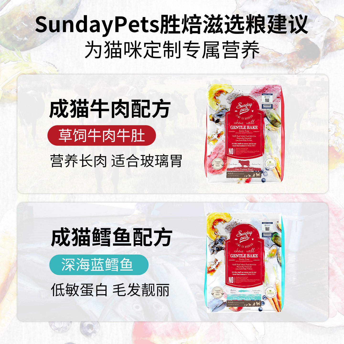 新西兰进口sundaypets烘焙猫粮成猫无谷鳕鱼牛肉全价通用粮试吃装