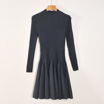 2025年秋款新品女装休闲风长袖中长款纯色拼接A字裙立领连衣裙子