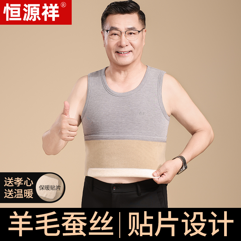 恒源祥秋冬季加绒加厚背心男羊毛蚕丝贴片中老年爸爸抗菌发热马甲