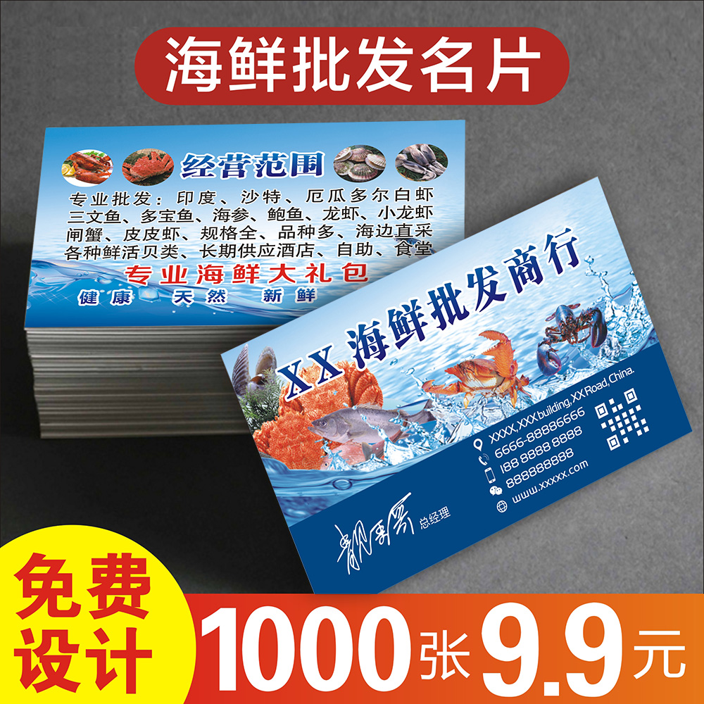 海鲜名片 水产品名片海鲜生鲜水族馆龙虾鲍鱼海参鱼类虾类养鸡养殖PVC透明塑料包邮名片设计制作印刷订做045