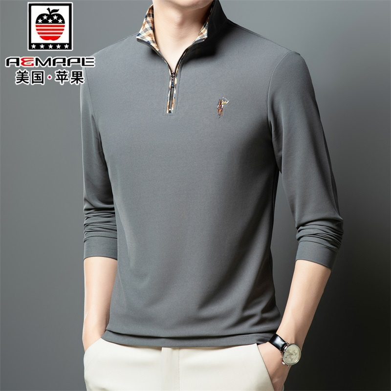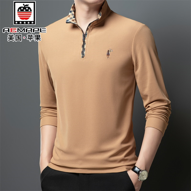 美国苹果春季男士长袖t恤宽松纯棉polo衫中年立领半拉链打底上衣