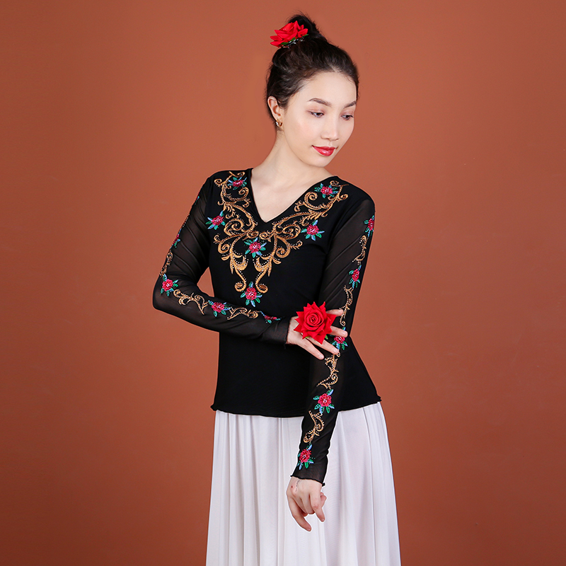 新疆舞蹈服新款绣花烫钻网纱上衣民族风碎花白色打底衫广场舞服饰