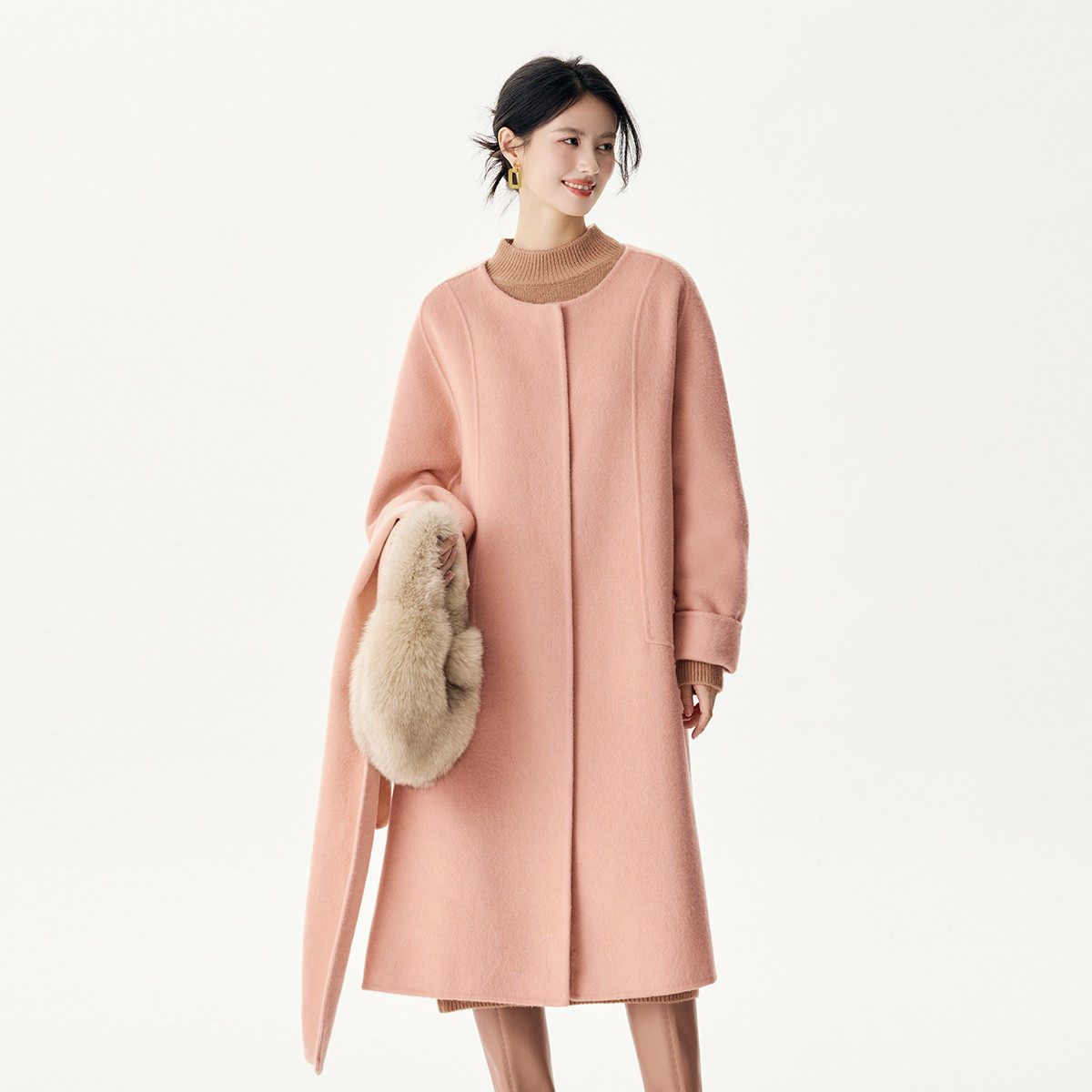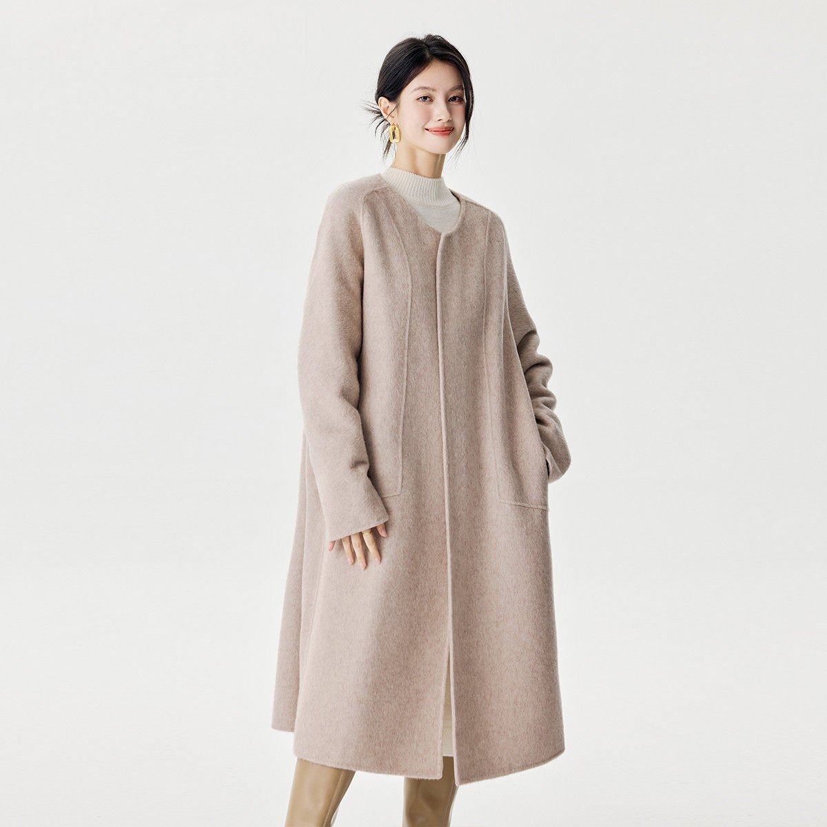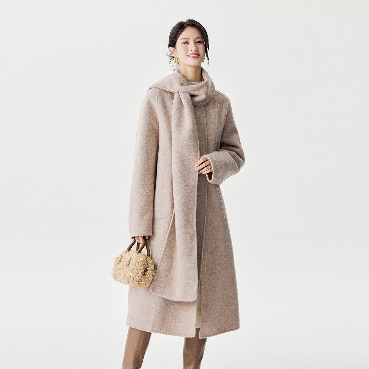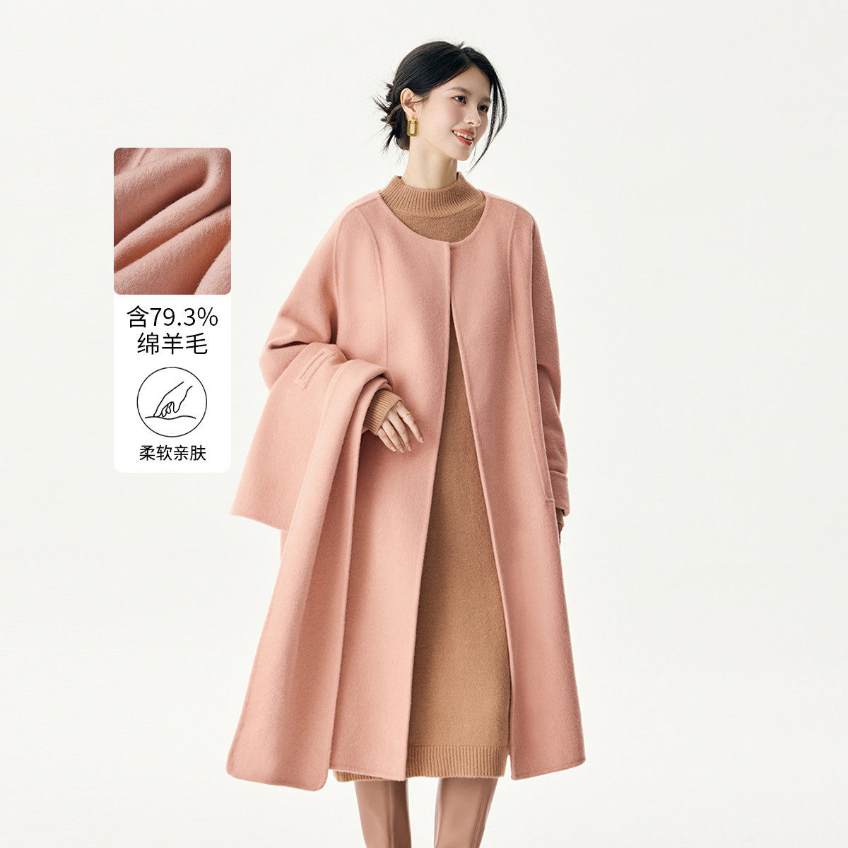 茵曼2025冬季新款围巾绵羊毛中长款双面毛呢外套女大衣休闲宽松