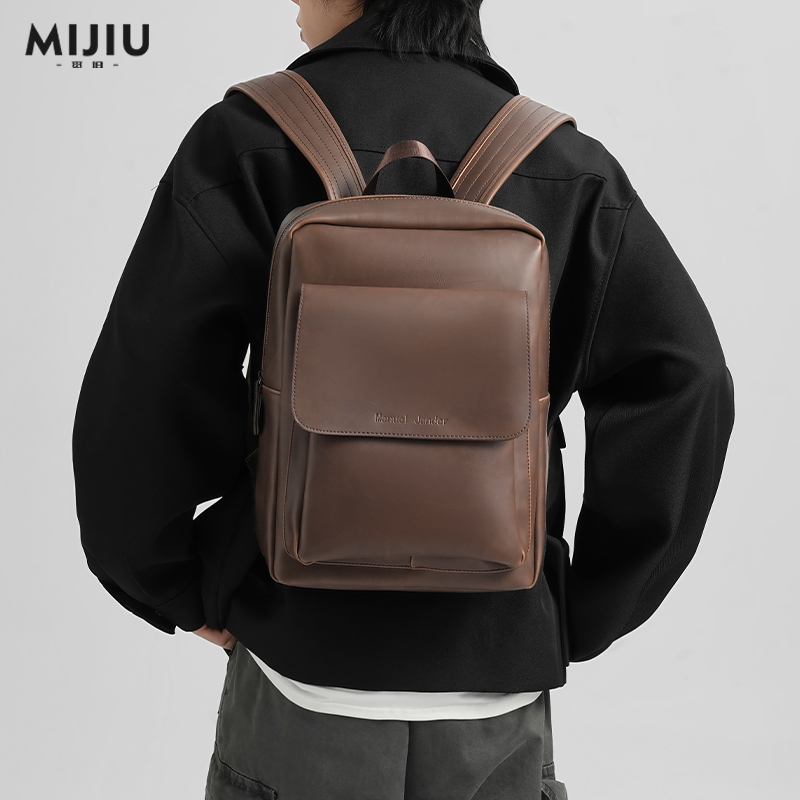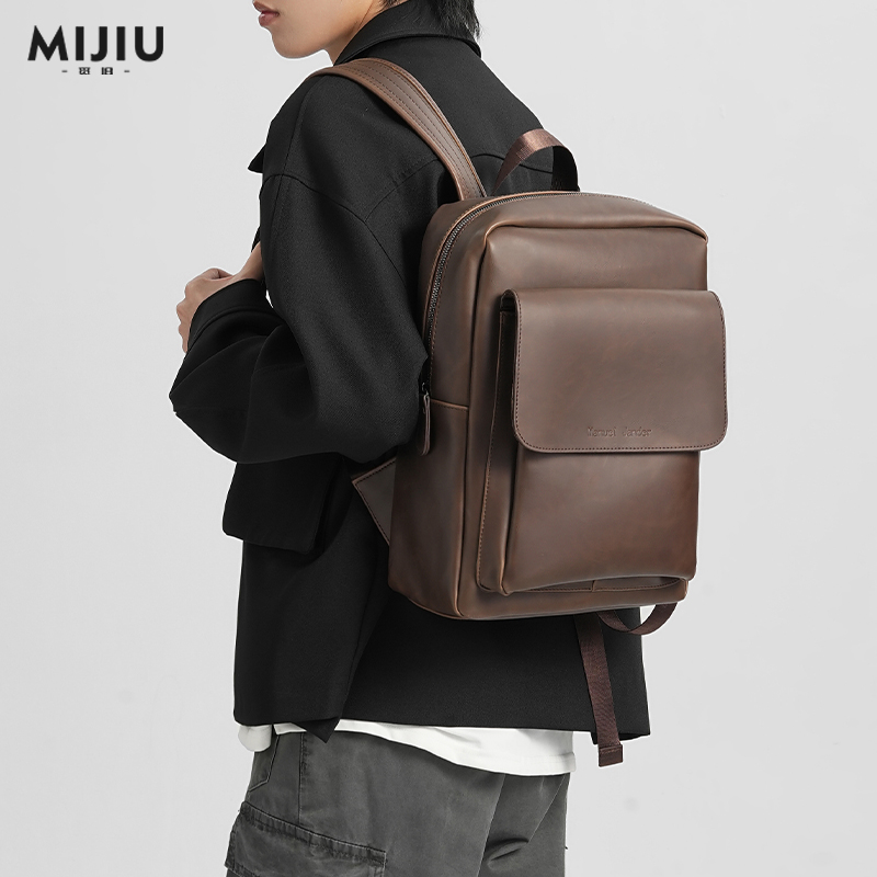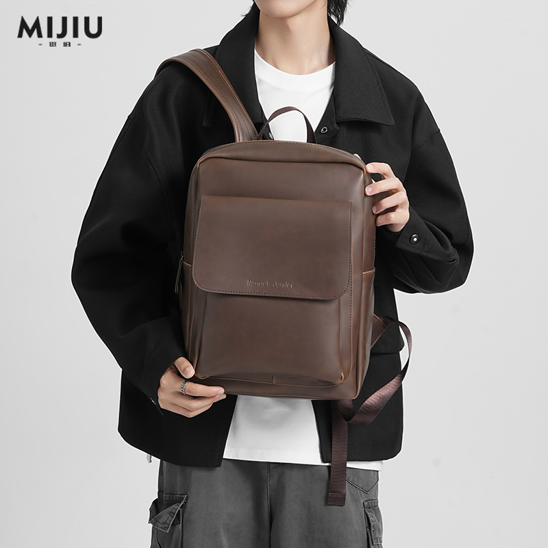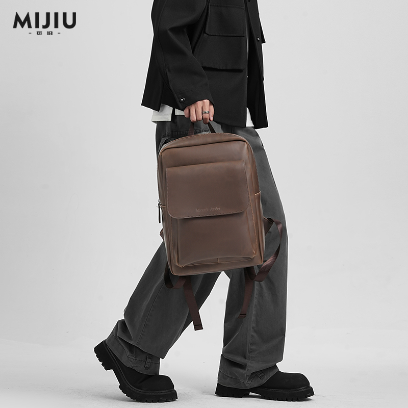 觅旧潮牌高级感双肩包男书包14寸16寸通勤皮质电脑男士商务背包