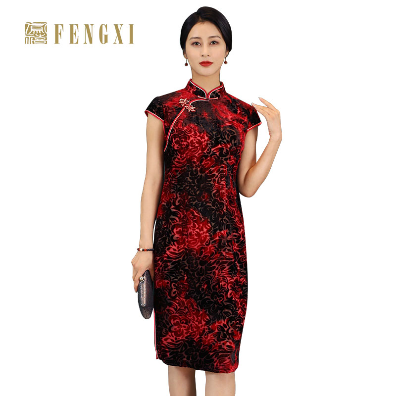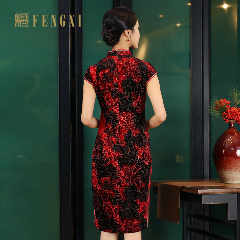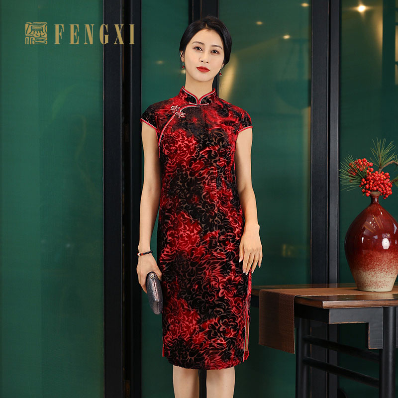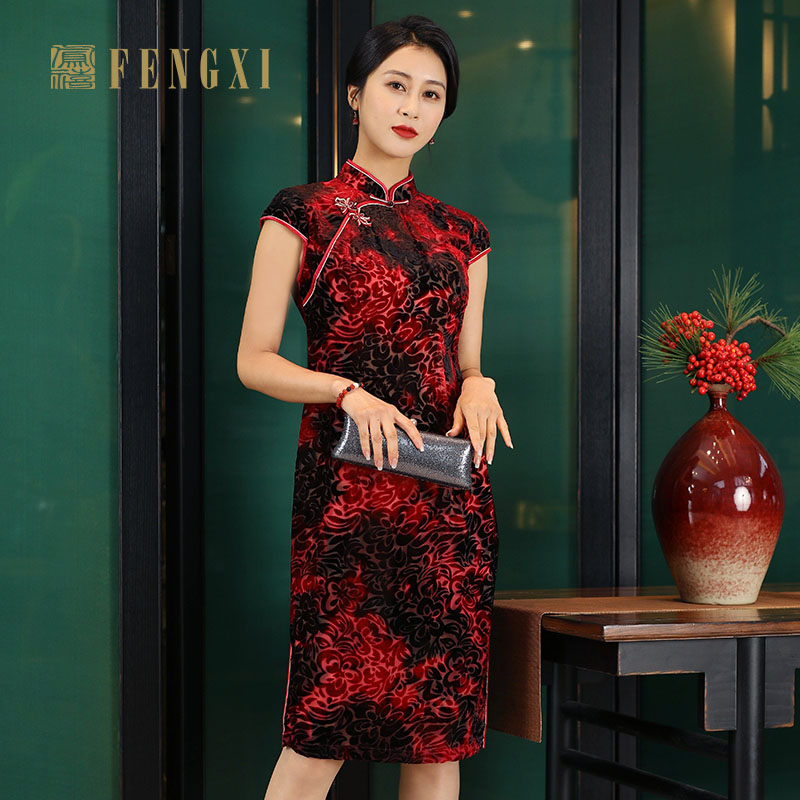 凤禧旗袍红黑色丝绒布旗袍婚庆晚宴聚会礼服裙喜妈妈喜婆婆婚宴女