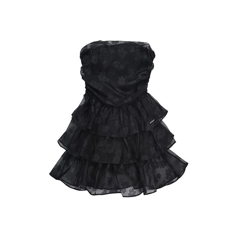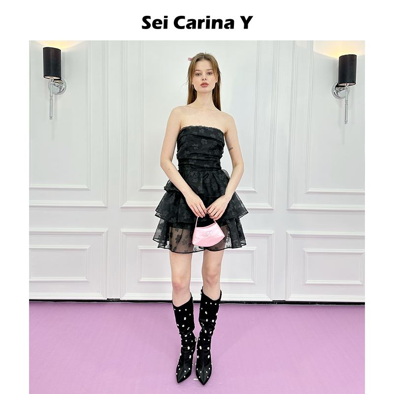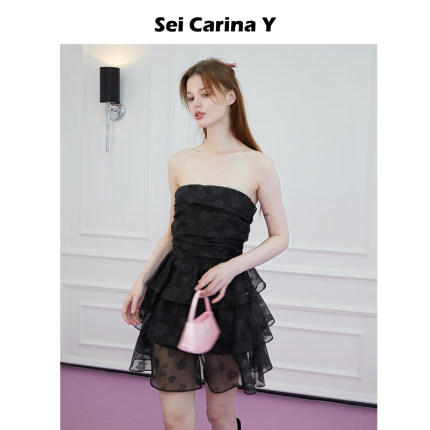 [7折]SeiCarinaY褶皱碎花黑色抹胸连衣裙新款女夏高级感蓬蓬短裙