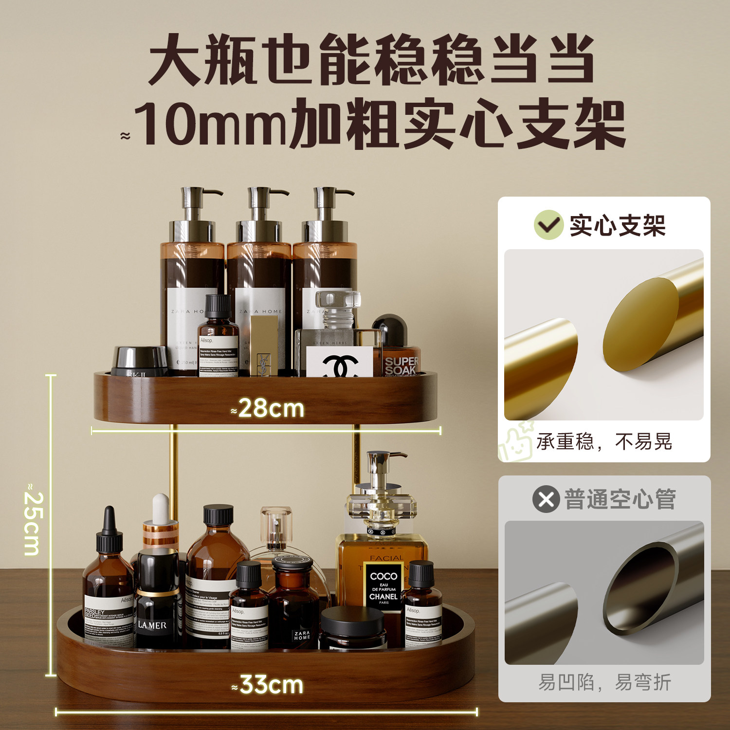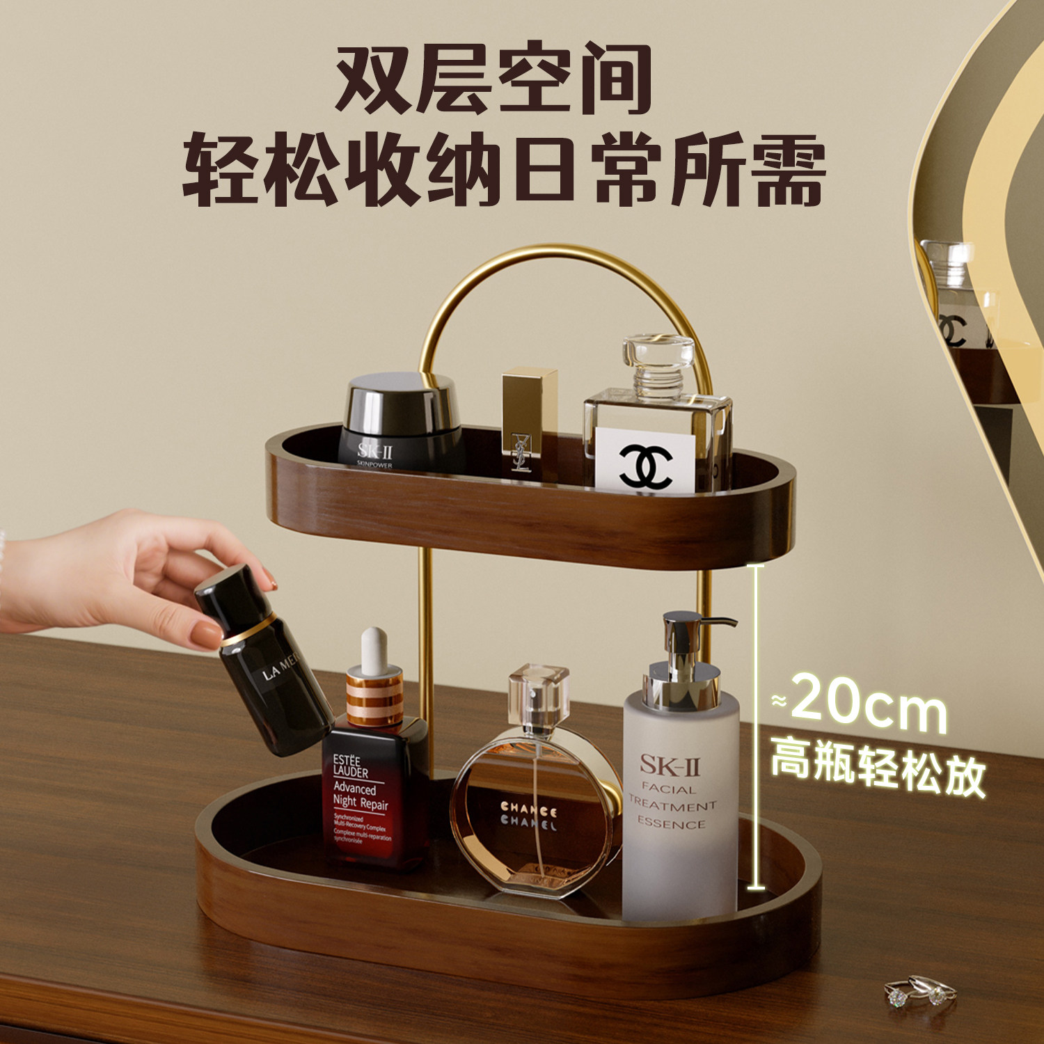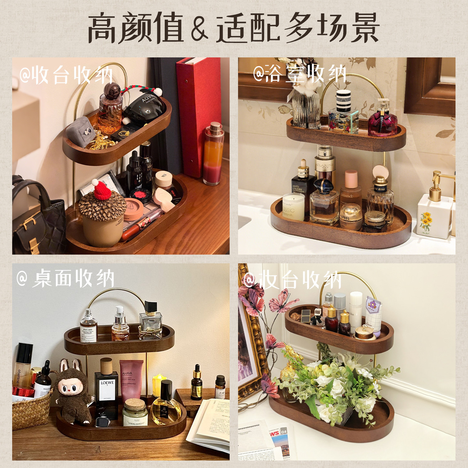 进口橡胶木中古双层化妆收纳架