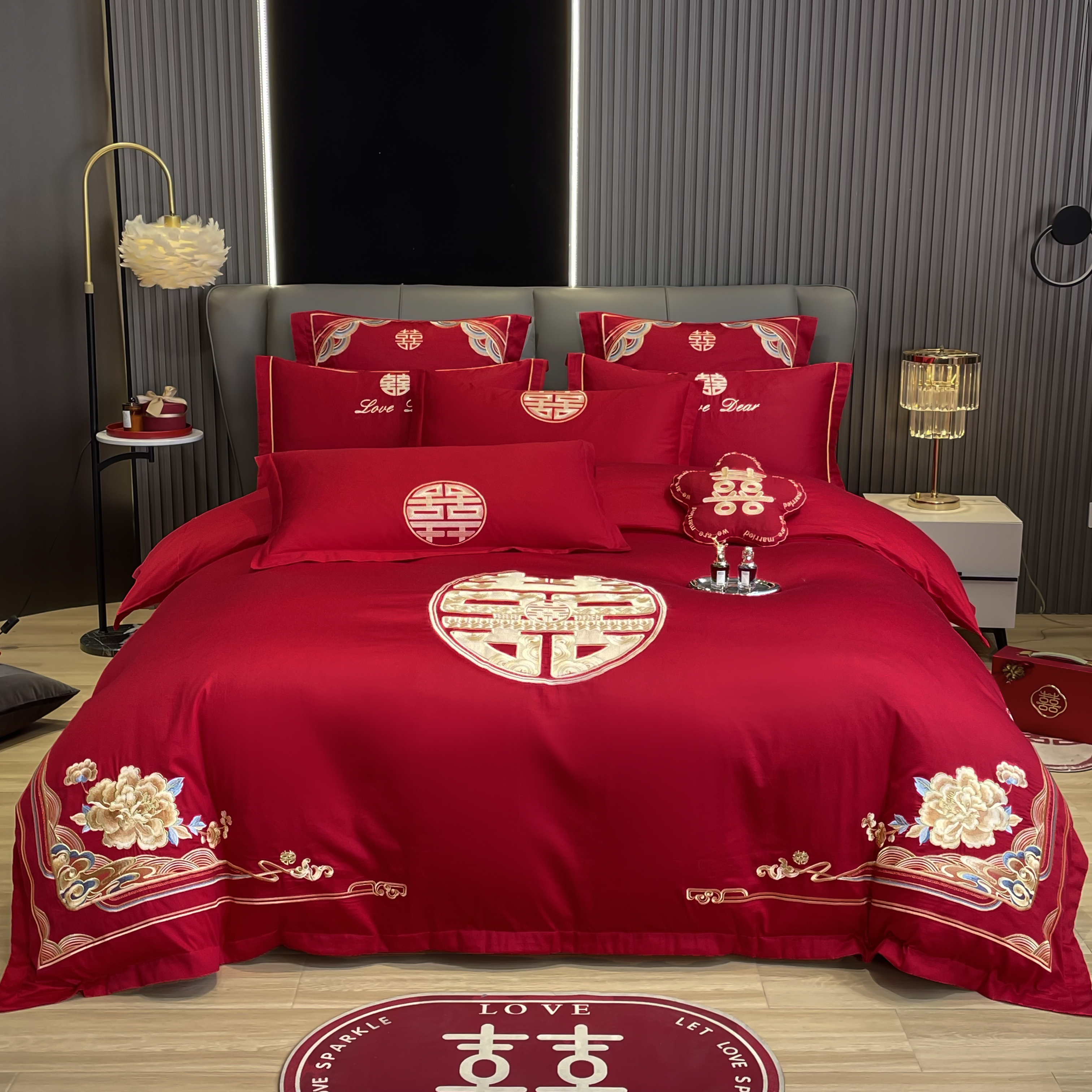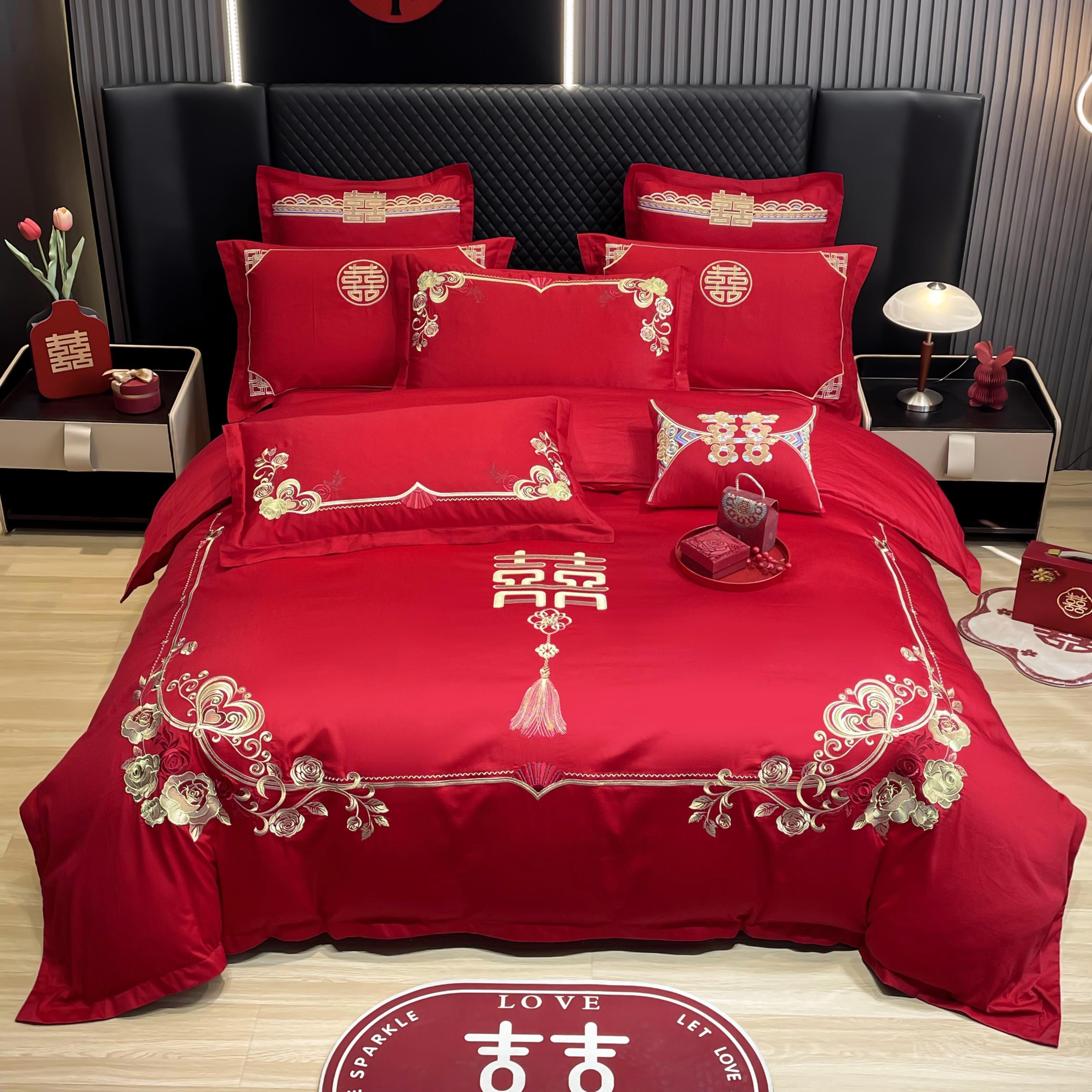 高档婚庆四件套大红全棉龙凤刺绣新婚嫁礼房结婚床上用品喜被床单