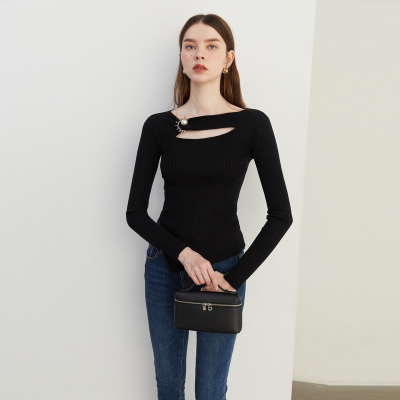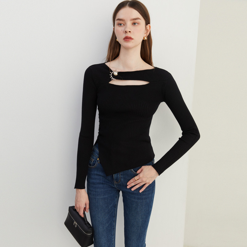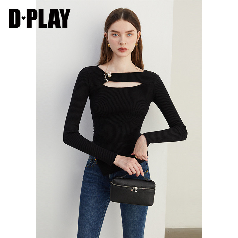 DPLAY2025秋季新款黑色毛衣女镂空修身针织衫时尚小衫上衣打底衫