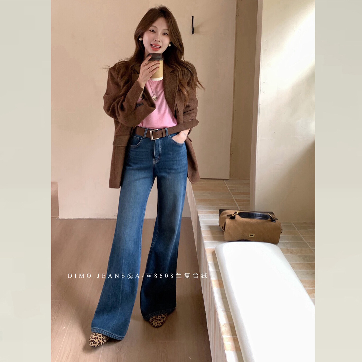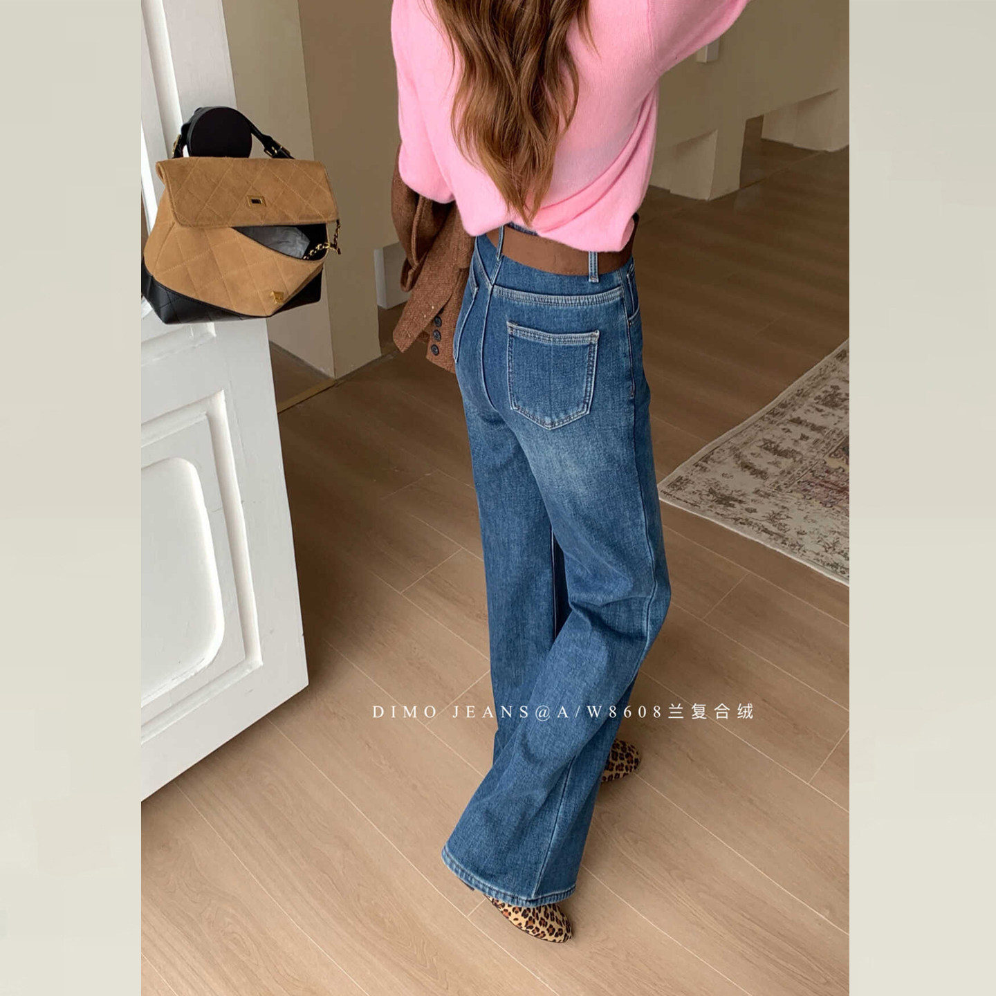 版型超好看的蓝色加绒微喇牛仔裤
