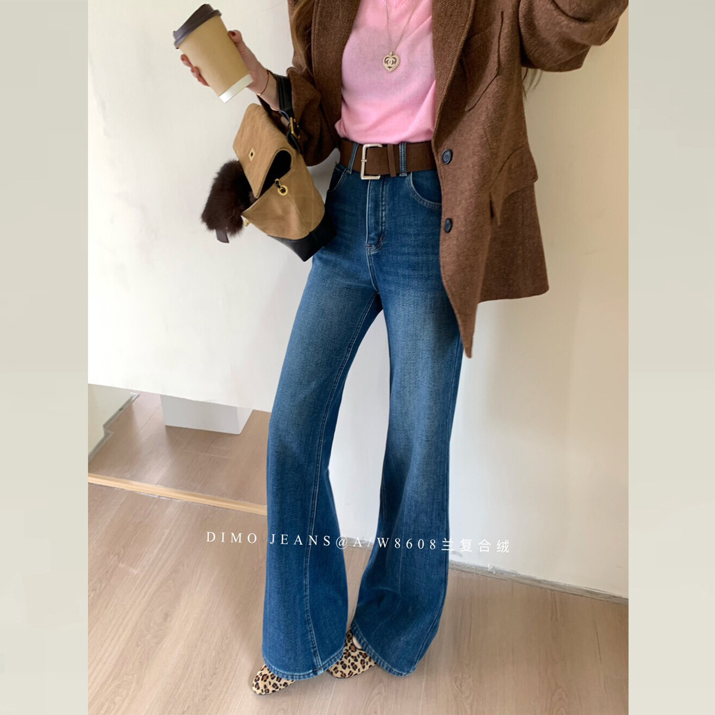 DIMO深蓝色加绒牛仔裤版型超好看的裤子女高腰显瘦不贴腿微喇裤女